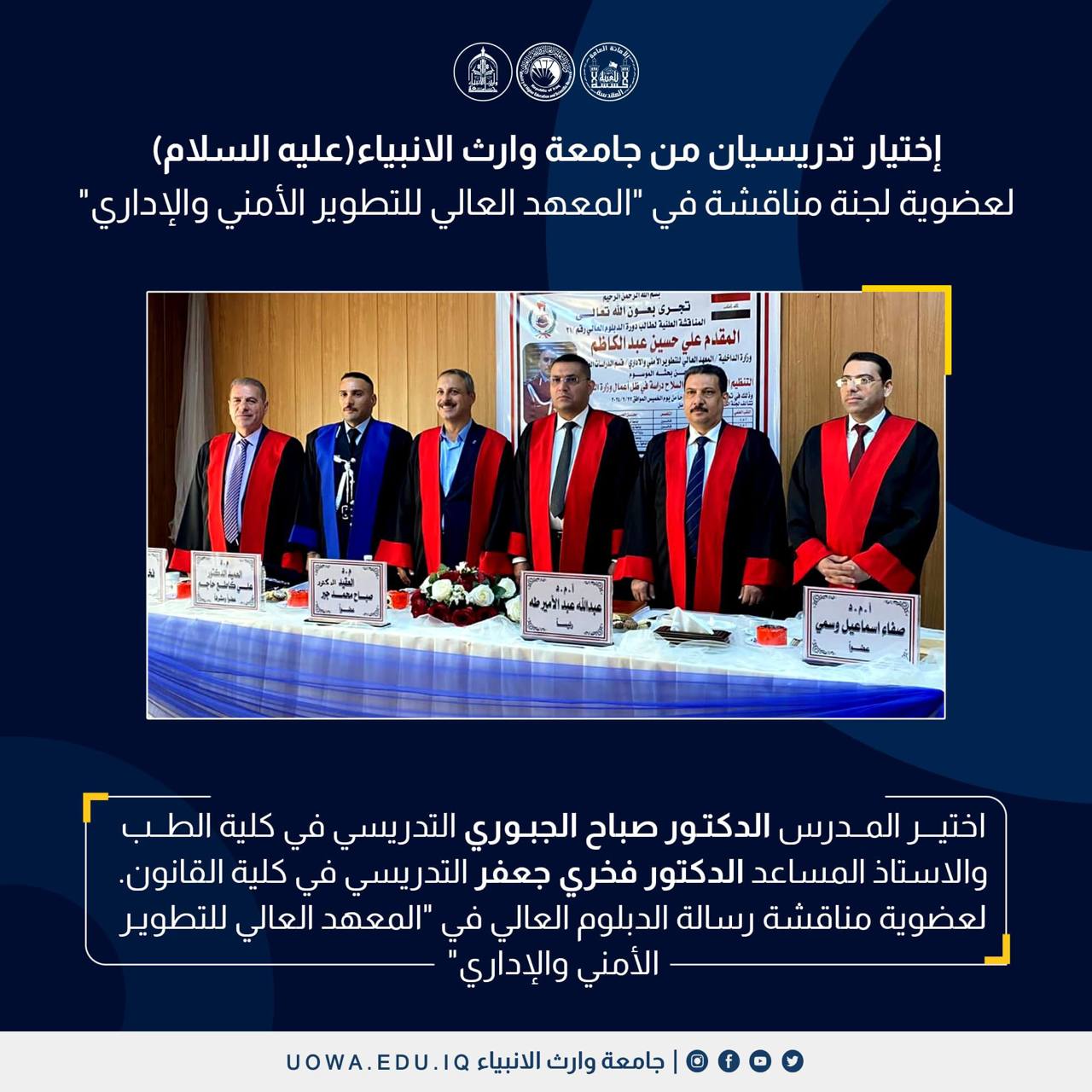 مشاركة تدريسين من كلية القانون لمناقشة رسالة الدبلوم العالي وهي خطوة مهمة في مسار الطالب الأكاديمي، حيث يُعرض العمل البحثي الذي قام به الطالب أمام لجنة أكاديمية مختصة لتقييم جودة البحث ومدى مساهمته في مجال التخصص. وتاتي هذه الخطوة لدعم التدريسين في مجال التقييم والبحث العلمي