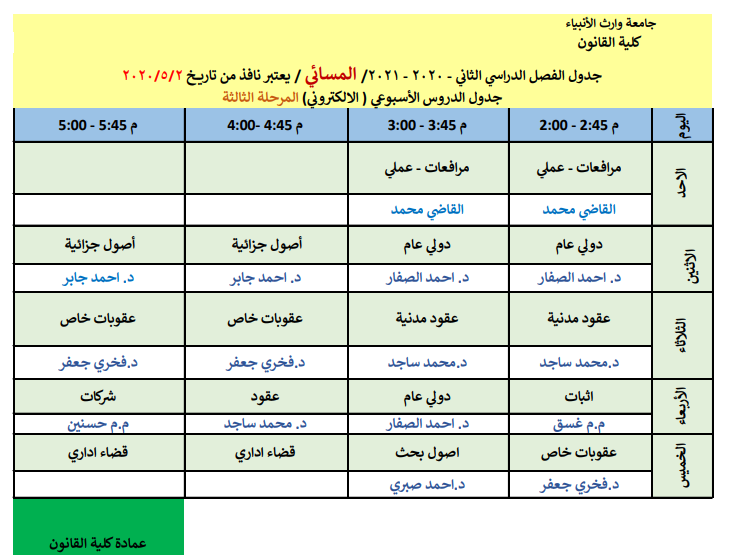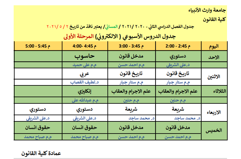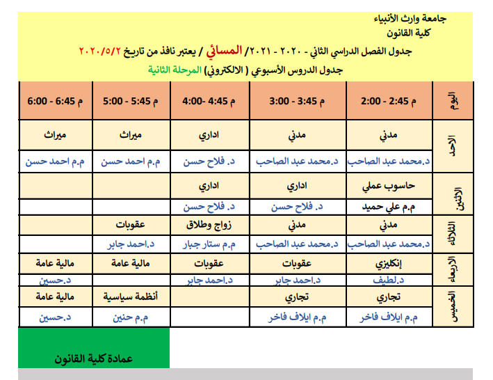 جدول المحاضرات الاسبوعية الالكتروني للدراسة المسائية للفصل الدارسي الثاني