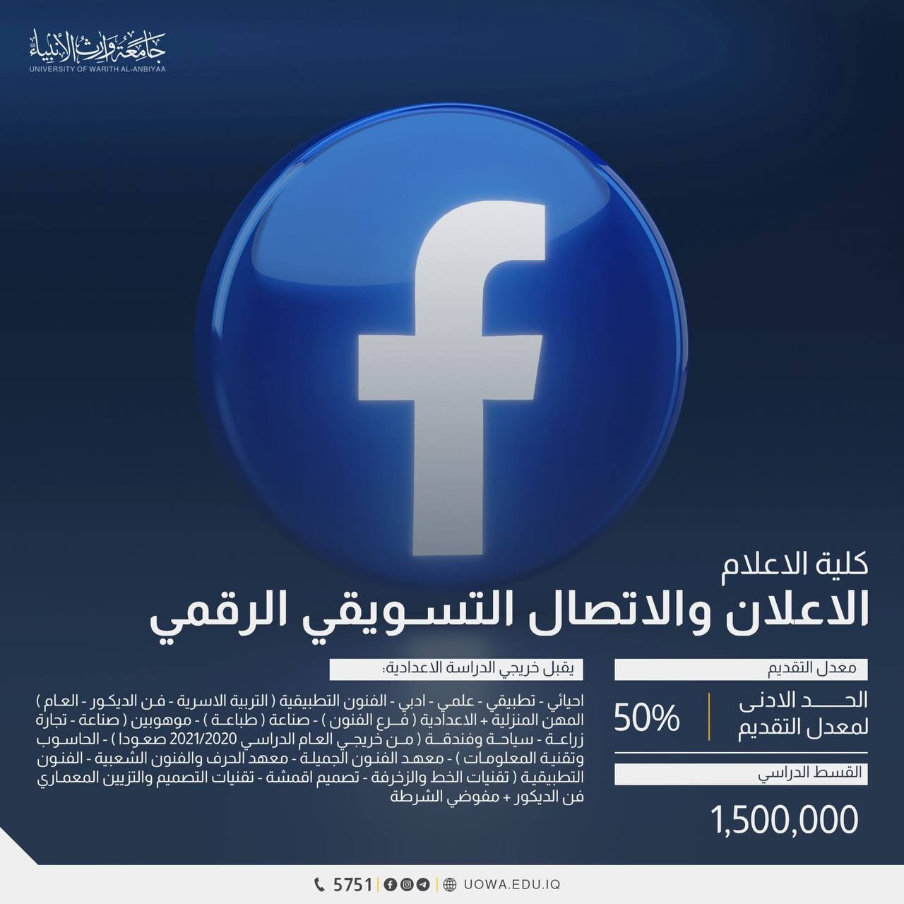 حددت اجور الدراسة لقسمي كلية الاعلام وللدراستين الصباحي والمسائي ب (1500000) مليون وخمسمائة الف دينار