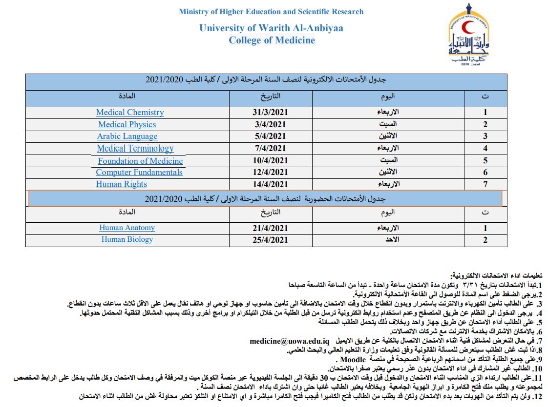 جدول الامتحان نصف السنة / كلية ألطب