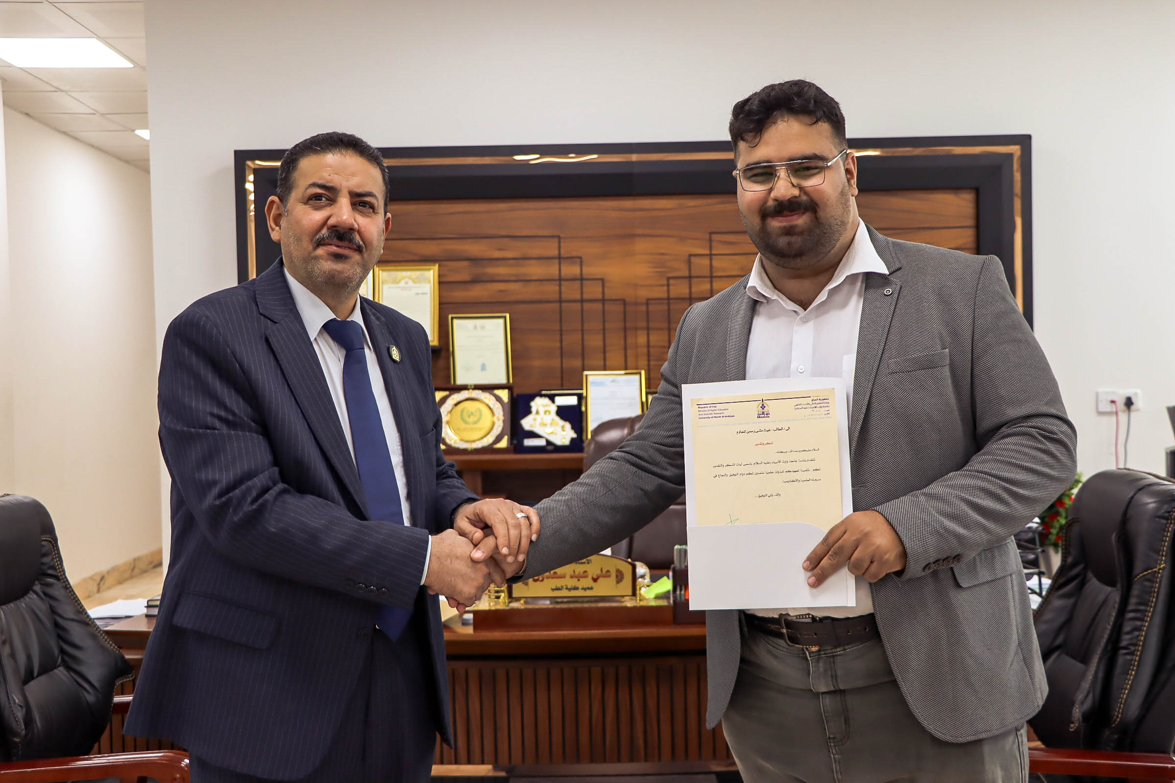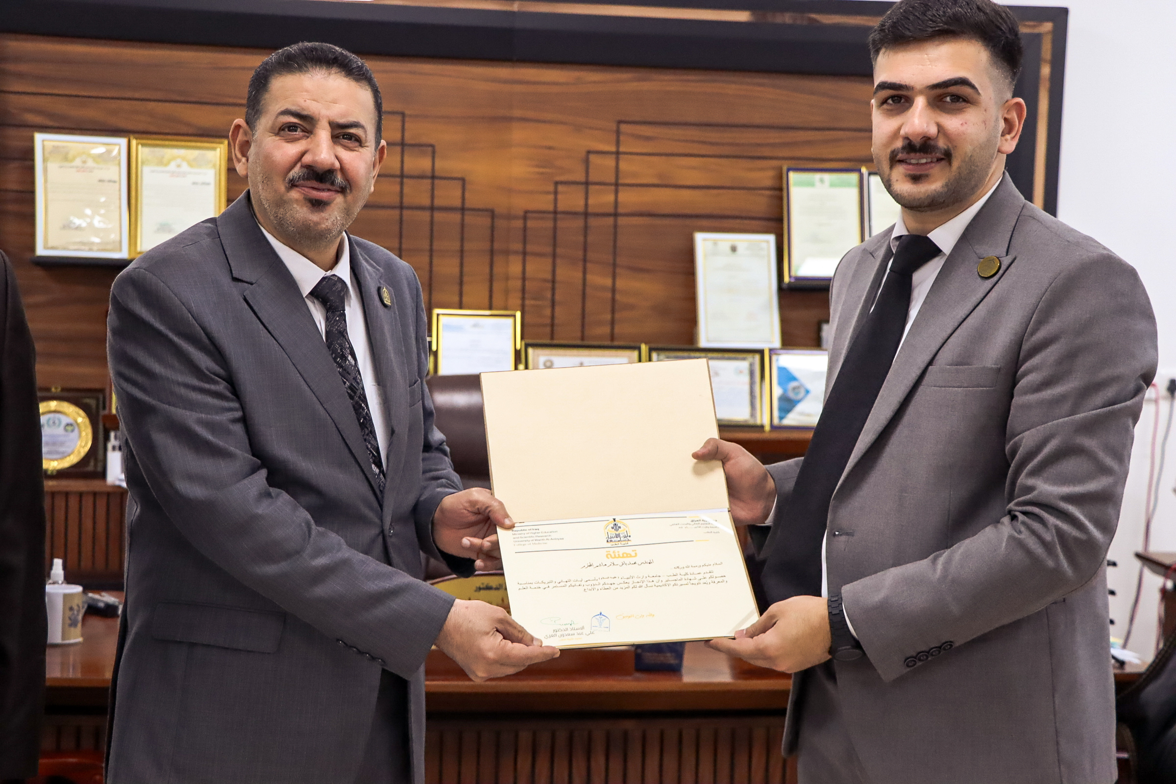 السيد عميد الكلية اليوم الأربعاء 26/11/2025 بتكريم الأستاذ الدكتور مُؤيّد النقيب في مقر الجامعة، تقديرًا لإنجازه الطبي الكبير والمتمثّل بإجراء أول عملية زرع كبد ناجحة في العراق.ويأتي هذا التكريم احتفاءً بجهود الدكتور النقيب العلمية والإنسانية، التي شكّلت خطوة مهمة في مسار تطوير جراحة وزرع الأعضاء في بلدنا العزيز، وتعزيز مكانة الكفاءات الوطنية في هذا المجال الحيوي.كلية الطب تؤكد دعمها المتواصل للمبادرات التي تُسهم في خدمة المجتمع وتطوير القطاع الصحي