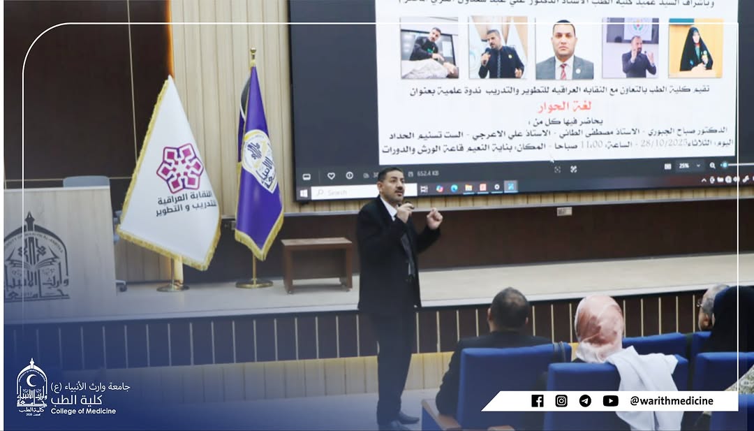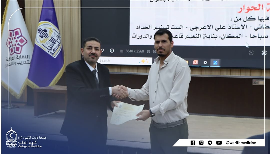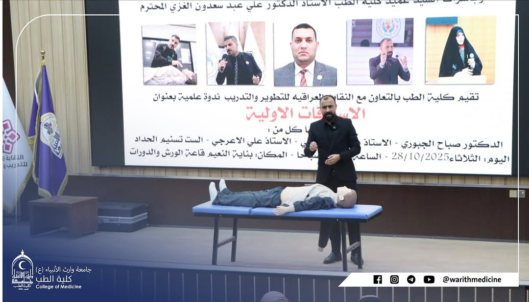 برعاية السيد رئيس جامعة وارث الأنبياء (ع) الأستاذ الدكتور إبراهيم الجياوي المحترم وبإشراف السيد عميد كلية الطب الأستاذ الدكتور علي عبد سعدون الغزي المحترم وبالتعاون مع النقابة العراقية للتطوير والتدريب أقامت كلية الطب ثلاث ندوات علمية تطويرية تهدف إلى تعزيز الوعي الأكاديمي والإنساني لدى الطلبة والتدريسيين وذلك صباح يوم الثلاثاء الموافق 28 / 10 / 2025 في قاعة الورش والدورات في بناية النعيماستُهلت الندوات بتلاوة سورة الفاتحة على أرواح شهداء العراق ثم عُزف النشيد الوطني العراقي وسط أجواء من الاعتزاز والانتماء الوطني والجامعي وقد تناولت الندوات محاور متعددة تمحورت حول قوة الكلمة ووعي الموقف ولغة الحوار وأهمية التواصل البنّاء في الحياة الجامعية والمهنية إضافة إلى محور الإسعافات الأولية الذي تضمن عروضاً عملية وتطبيقات ميدانية حول كيفية التعامل مع الحالات الطارئة قبل وصول الكادر الطبي ألقى الندوات كل من الدكتور صباح الجبوري والأستاذ مصطفى الطائي والأستاذ علي الأعرجي والأستاذة تسنيم الحداد الذين أثروا الحضور بمعلوماتهم وخبراتهم الميدانية وفي ختام الفعاليات قام السيد عميد كلية الطب الأستاذ الدكتور علي عبد سعدون الغزي بتوزيع الشهادات التقديرية على السادة المحاضرين تقديراً لجهودهم المتميزة في إنجاح هذه الندوات