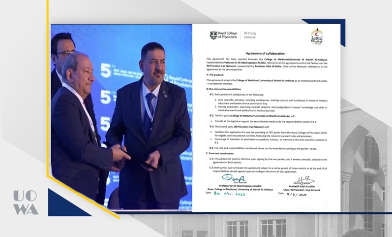 في إطار التوجه الاستراتيجي لكلية الطب جامعة وارث الأنبياء (ع) نحو الانفتاح الأكاديمي وتعزيز الشراكات العلمية الدولية مع المؤسسات المرموقة وحرصها على تطوير التعليم الطبي وفق أحدث المعايير الدولية وقّعت كلية الطب اتفاق تعاون علمي مع شبكة الكلية الملكية للطب (Royal College of Physicians / London-Iraq Network) وهي إحدى أبرز الشبكات المتخصصة بتعزيز التعليم الطبي المستمر ورفع كفاءة الأطباء والكوادر الأكاديمية في العراق والمنطقة.جرى توقيع الاتفاق من قبل الأستاذ الدكتور علي عبد سعدون الغزي عميد كلية الطب في جامعة وارث الأنبياء (ع) ممثلاً عن الكلية وبحضور الأستاذ الدكتور هلال الصفار رئيس شبكة الكلية الملكية للطب في العراق بإشراف رئيسة الكلية الملكية بروفسور ممتاز باتل ورئيس لجنة عمداء كليات الطب الدكتور أمين عبد الحسن العلواني .
