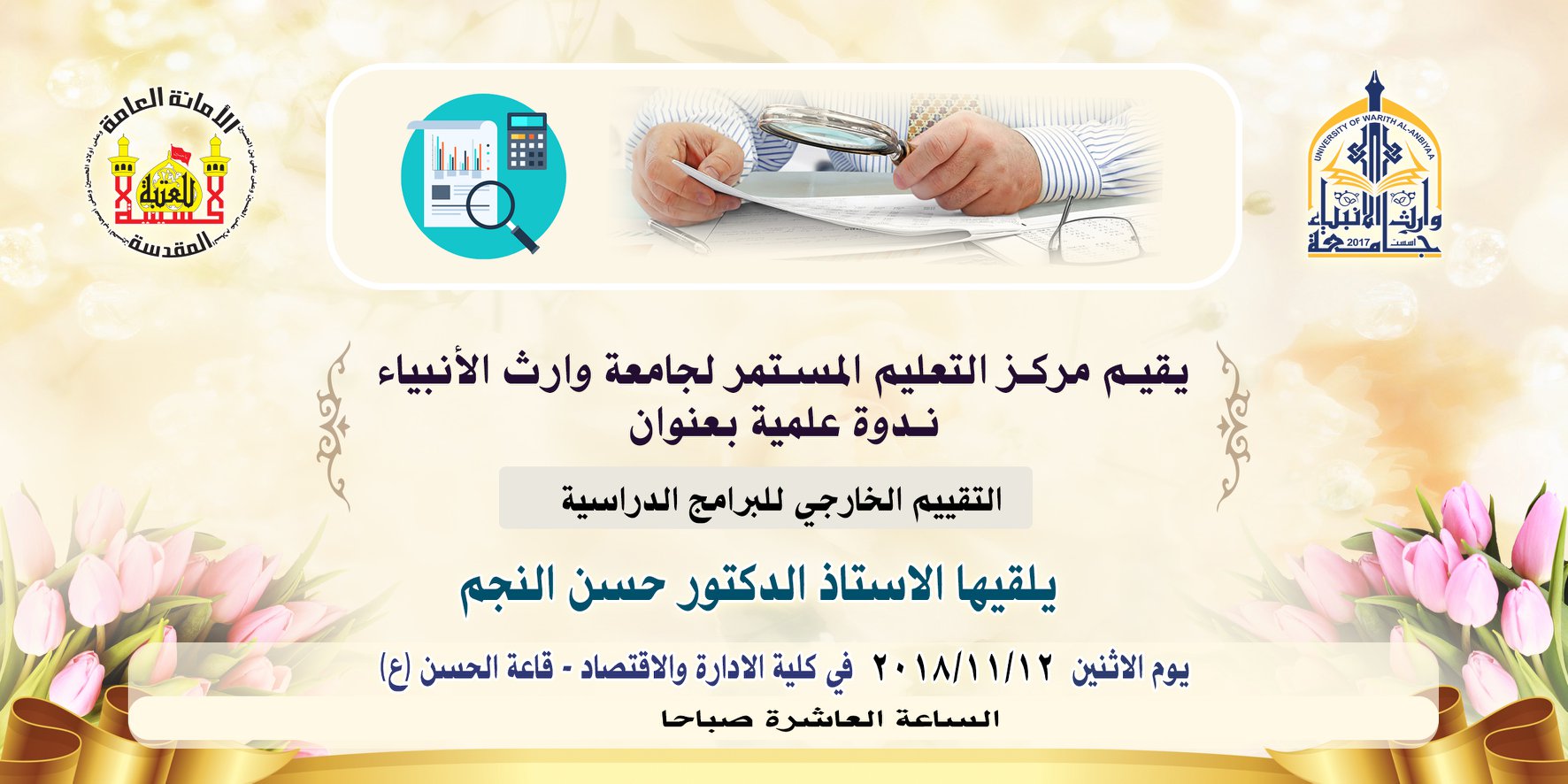 #جامعة_وارث_الانبياء_التابعة_للعتبة_الحسينية_المقدسة تعقد ندوة علمية بعنوان (التقييم الخارجي للمناهج الدراسية) القاها الأستاذ الدكتور حسن النجم مسؤول قسم تطوير المواد الأنشائية في جامعة ليفربول جون موريس في بريطانيا وكان الهدف من الندوة النهوض بالبرنامج التعليمي على مستوى جامعتنا وكذلك امكانية الإتفاق على عمل توأمة لجامعتنا مع الجامعات البريطانية اذ بين الدّكتور ان مفهوم التوأمة هو نقل المعارف وتعزيز التضامن الأكاديمي بين الجامعات في شتى أنحاءالعالم ,وأضاف أنه على تواصل مستمر مع الجامعة وهناك خطوات تحضيرية معها لأعداد خطط استراتيجية بالأعتماد على التجارب العالمية وخاصة في جامعة جون موريس البريطانية حيث تتلخص في تطوير الأداء العلمي الذي يسهم في الأرتقاء بالجامعة الى مصاف الجامعات العالمية.