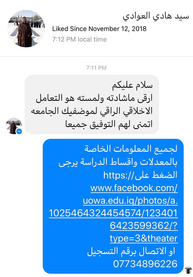 تم فتح نافذة التقديم على #جامعة_وارث_الانبياء للحالات الفردية التي لم يسعفهم الوقت لاتمام تقديمهم ولمدة يوم واحد ((فقط يوم السبت الموافق 24/11/2018)).للاستفسار اكثر يرجى الاتصال على :