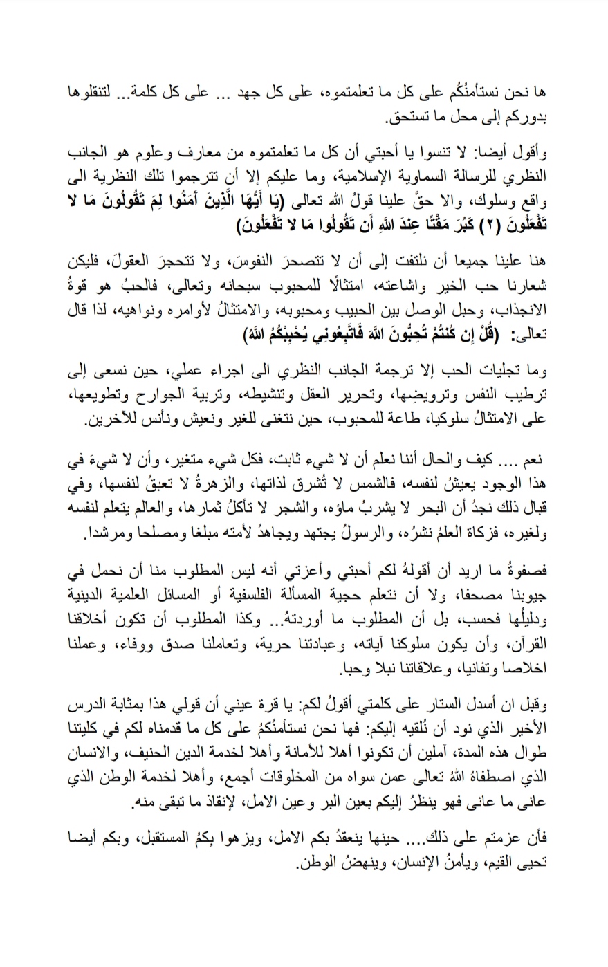 6- العمل على معالجة التحديات التي تواجه المجتمع، منها: الإلحاد، خطر المخدرات، عدالة توزيع الثروات، حقوق وواجبات الإنسان، الاهتمام بالطفل ،الاهتمام بالأسرة ، (معالجة مظاهر الانحرافات الفطرية والأخلاقية)7- إن كرامة الإنسان محترمة ومصانة مطلقا.8- الغاية من الأديان تنظيم العلاقة بين الإنسان وربه وبين الإنسان وأخيه الإنسان.