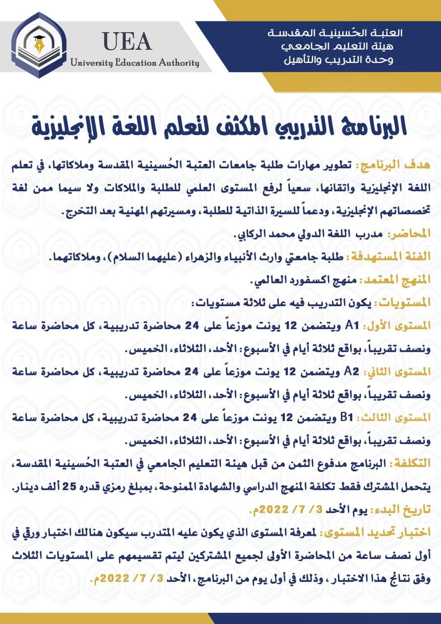 بتوجيه من سماحة المتولي الشرعي للعتبة الحسينية المقدسة الشيخ عبد المهدي الكربلائي(دام عزه) وبرعاية السيد رئيس الجامعة الاستاذ الدكتور ابراهيم الحياوي وبالتعاون مع المديرية العامة لتربية محافظة كربلاء المقدسة.