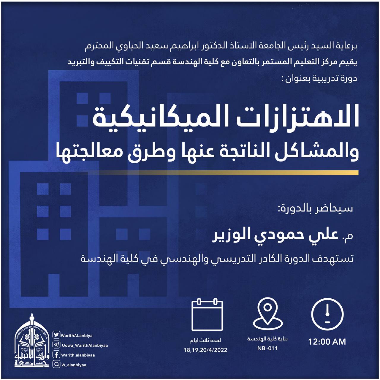 برعاية رئيس الجامعة الاستاذ الدكتور ابراهيم الحياوي يقيم مركز التعليم المستمر وبالتعاون مع كلية الهندسة/ قسم تقنيات التبريد والتكييف دورة تدريبية بعنوان " الاهتزازات الميكانيكية والمشاكل الناتجة عنها وطرق معالجتها"، لمدة ثلاثة أيام (18-19-20 / 4/ 2022).