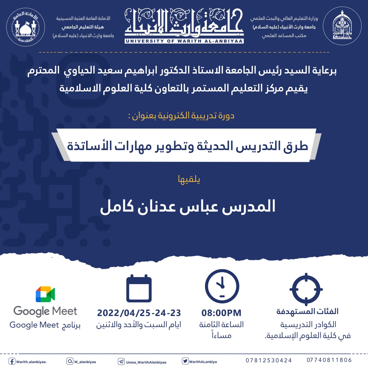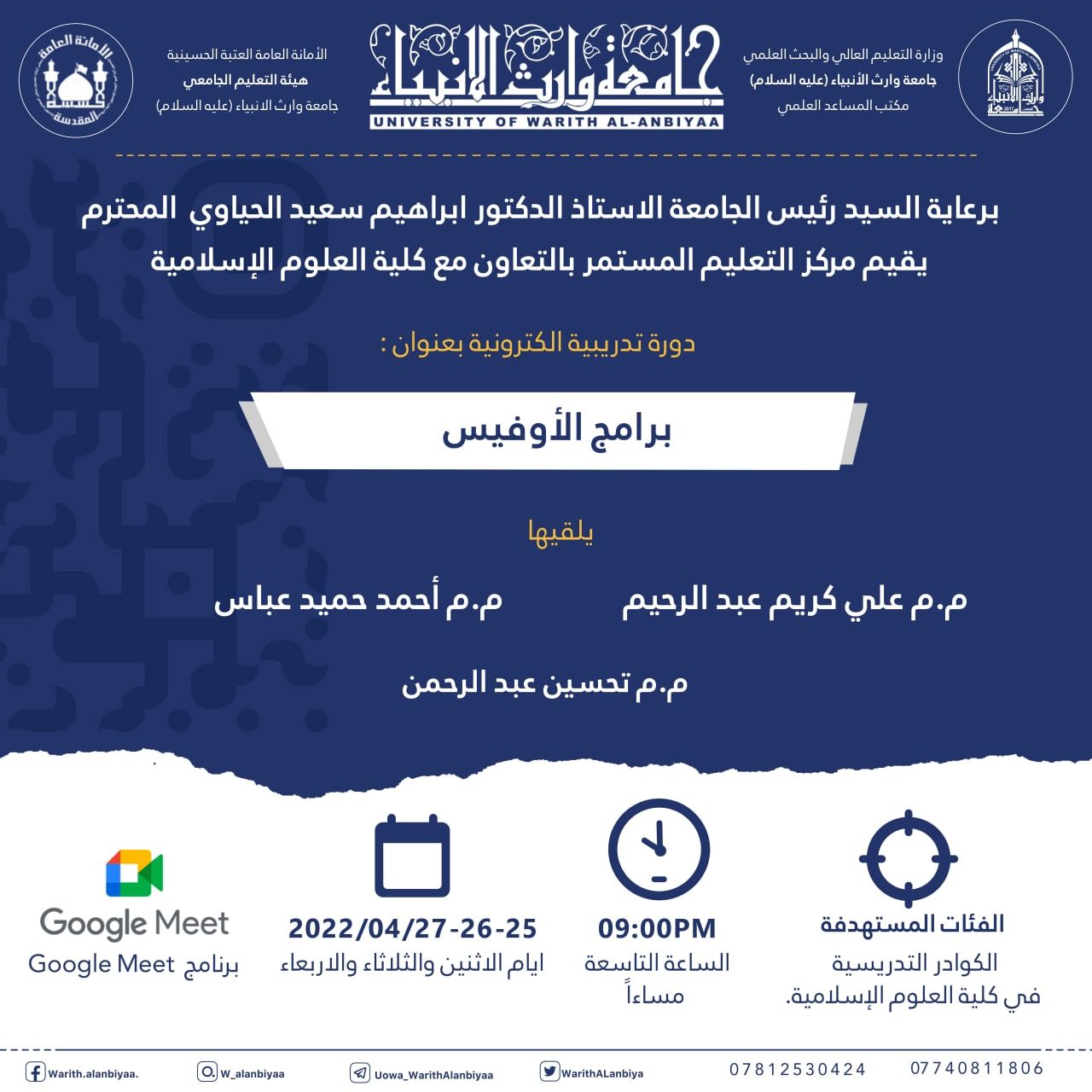 وبحضور ومتابعة السيد  عميد كلية العلوم الاسلامية أ.م.د طلال الكمالي المحترم  قدم كل من المدرب الاستاذ ليث السيلاوي والمدرب السيد علي الهاشمي دورتهما ضمن متطلبات البرنامج الذي تقيمه الاكاديمية في تاهيل وتمكين طلبة الجامعات لسوق العمل.