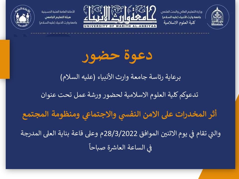 برعاية السيد رئيس الجامعة الاستاذ الدكتور ابراهيم سعيد الحياوي المحترم تقيم كلية العلوم الإسلامية ندوة علمية تحت عنوان (دور الشباب في الحركة المهدوية لتمهيد الظهور) تستضيف فيها سماحة السيد رشيد الحسيني دام عزه .يوم الاحد الموافق 20/3/2022 في تمام الساعة 12:30 على القاعة المدرجة في بناية العلى