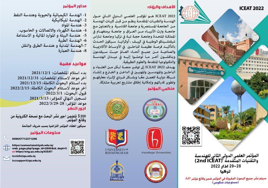 لمعرفة آخر ما توصل إليه الباحثون في ميدان الهندسة والتكنولوجيا المتقدمة والعلوم التطبيقية من جميع أنحاء العالم تعقد كلية الهندسة في الجامعة المستنصرية، وبالتعاون مع جامعة وارث الانبياء، جامعة برمنكهام البريطانية، جامعة كييف الوطنية الاوكرانية وجامعة حجة تبه التركية مؤتمرها الدولي العلمي للهندسة والتقنيات المتقدمة‪ICEAT2022 ‬والذي سيقام افتراضياً يوم الاثنين 28/3/2022، ويستمر ليومينبمشاركة العديد من الدول الاجنبية حيث أن جميع البحوث ستنشر في المستوعبات العالميةرابط الجلسة الافتتاحية‏https://zoom.us/j/8922257718...