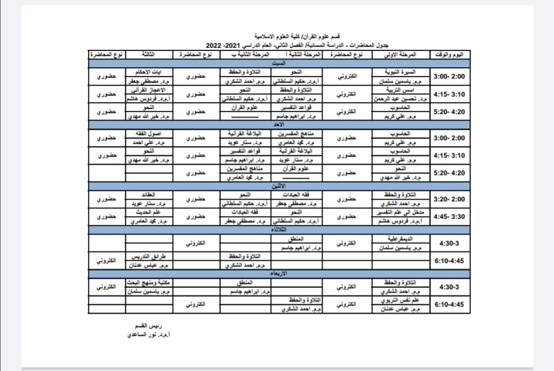 جدول الدروس الدراسة المسائية / قسم علوم القرآن