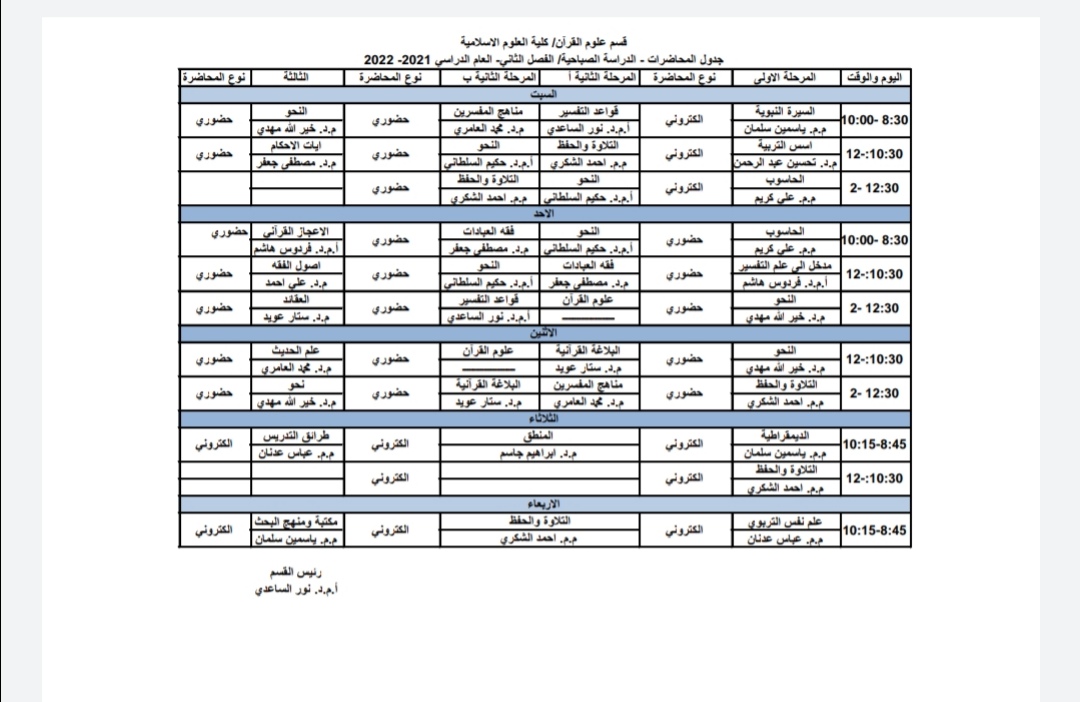 جدول الدراسة الصباحية / قسم علوم القرآن
