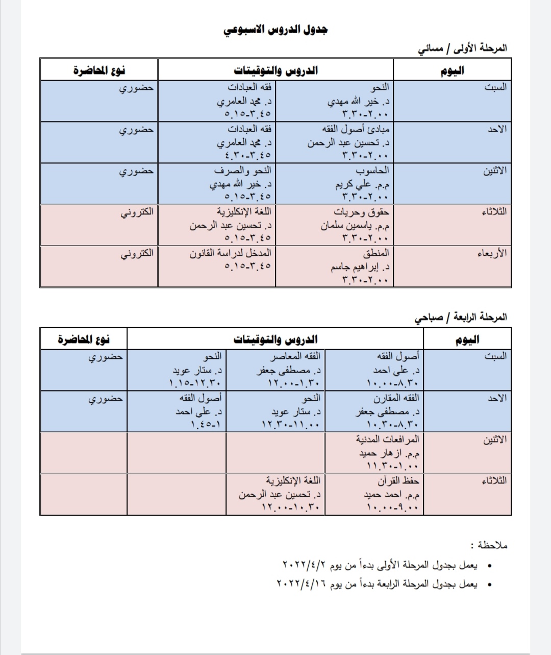جدول الدروس الأسبوعي لقسم الفقه واصوله