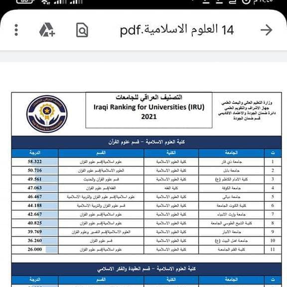 حصدت كلية العلوم الاسلامية/ قسم الفقه المرتبة الرابعة و قسم علوم القران المرتبة السابعة بين كليات العلوم الاسلامية الحكومية والاهلية في عموم العراق.وجاء هذا الترتيب في تصنيف(IRU )الذي أطلقته وزارة التعليم العالي والبحث العلمي العراقية/ دائرة ضمان الجودة والاعتماد الاكاديمي لتصنيف الكليات الحكومية والاهلية حسب معاير حددتها الوزارة.التي تضم الجودة والاعتماد البرامجي 35% وفاعلية البحث العلمي 30% وأعضاء الهيأة التدريسية 20% والطلبة 15%.