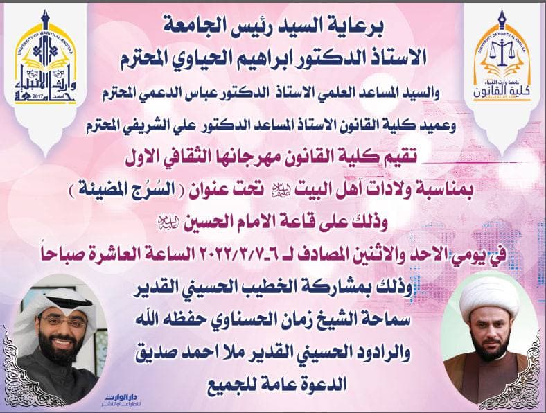 برعاية رئاسة جامعة وارث الأنبياء واشراف عميد كلية القانون، نظمت كلية القانون في الجامعة مهرجانها الثقافي الأول تحت عنوان (السُرج المضيئة) تزامناً مع  ذكرى الولادات الميمونة لأهل بيت النبوة (عليهم السلام).