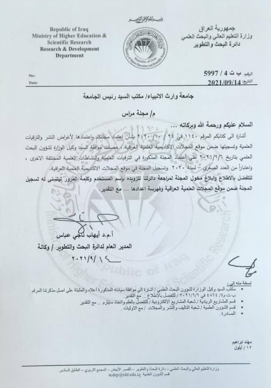 حصلت موافقة السيد المدير العام لدائرة البحث والتطوير في وزارة التعليم العالي والبحث العلمي على استحداث مجلة (مراس) العلمية بموجب كتاب دائرة البحث والتطوير المرقم (ب ت4 /5997) في 2021/9/14 ، وقد تحدثت الدكتورة نور الساعدي مدير تحرير المجلة قائلة :