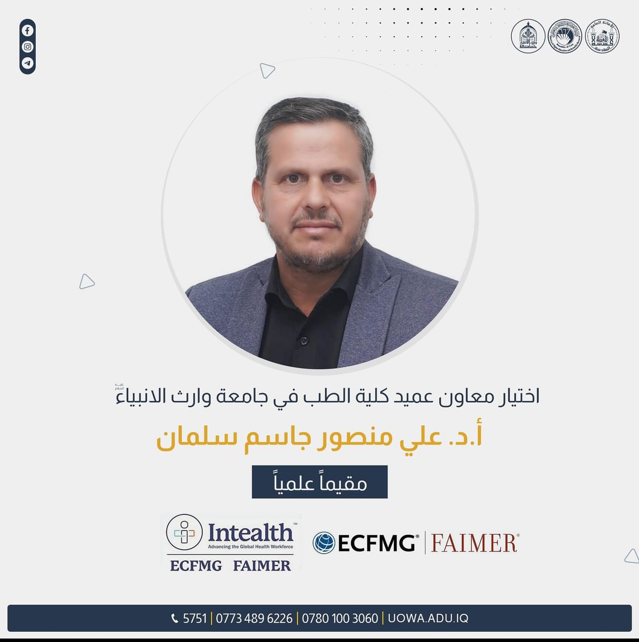 اختير الاستاذ الدكتور علي منصور جاسم معاون عميد كلية الطب مقيماً علمياً للمتقدمين على زمالة FAIMER, IFI Fellowship for Medical Education. للعام ٢٠٢٤.وعلى اثره حصل على خطاب شكر من مؤسسة FAIMER و بالتحديد المقر الرئيسي International FAIMER Institute