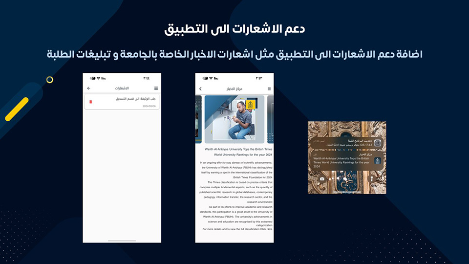 وفي إطار تعزيز التواصل وتقديم الإشعارات الهامة، تمت إضافة دعم الإشعارات إلى التطبيق، مما يتيح للمستخدمين استقبال الأخبار والتنبيهات المتعلقة بالجامعة مباشرة عبر التطبيق.
