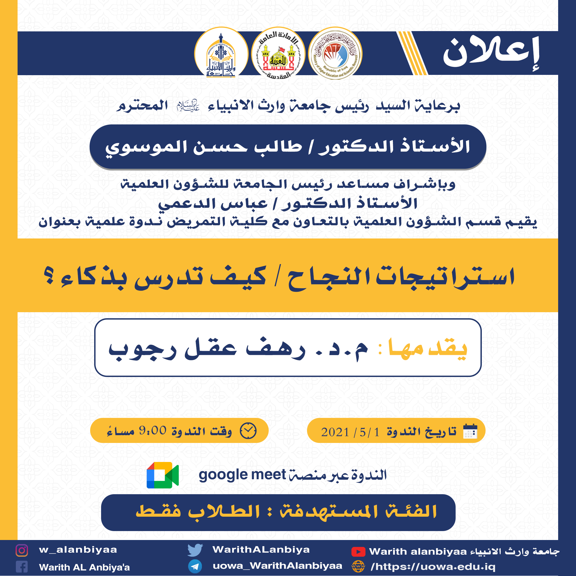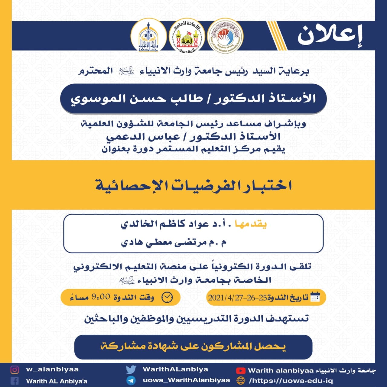 يقيم مركز التعليم المستمر في جامعة وارث الانبياء(عليه السلام) ندوة علمية إلكترونية عبر منصه التعليم الالكتروني الخاصه بالجامعة ومن خلال الرابط التالي:https://meet.google.com/iee-roxt-okq