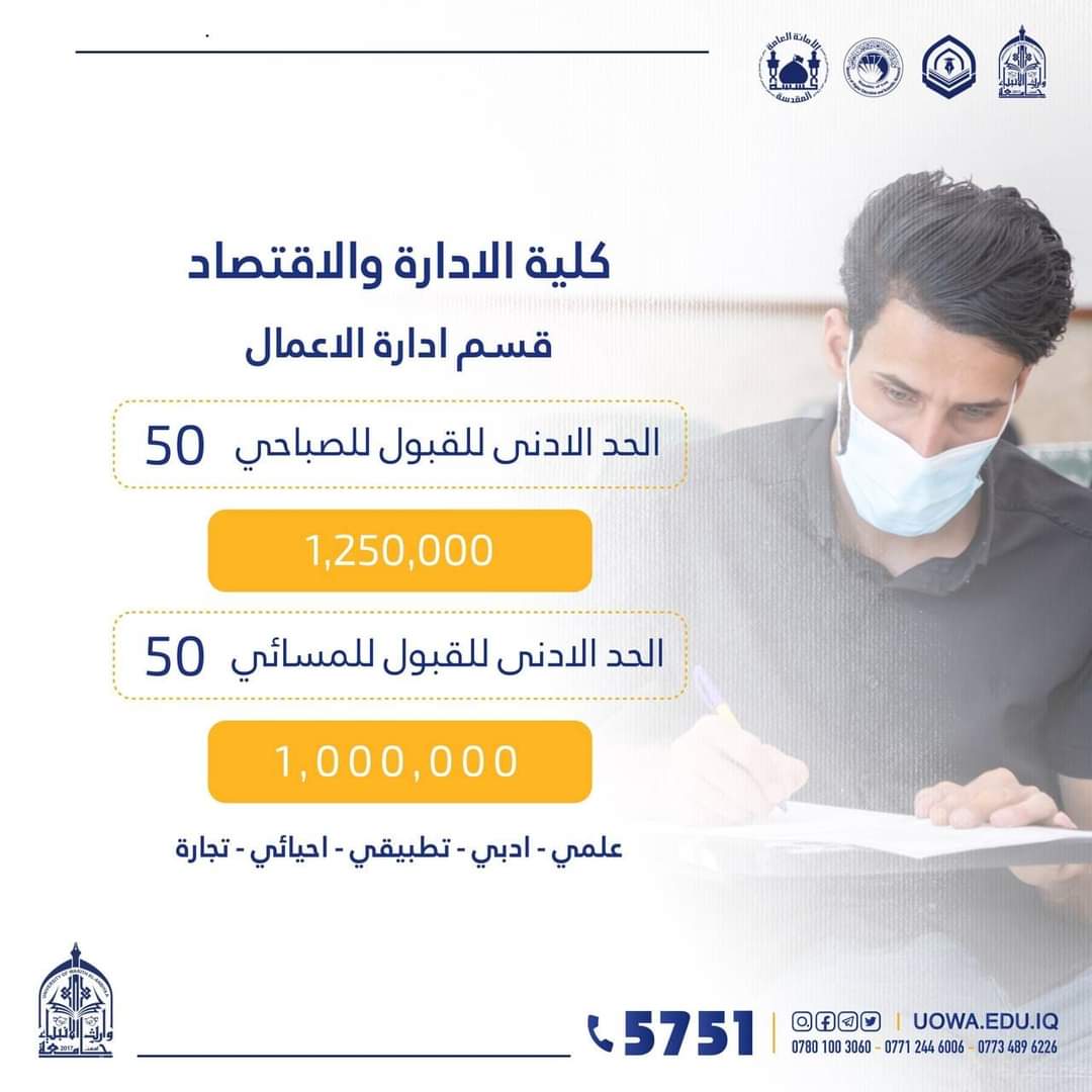 نبذه مختصرة عن ???? قسم ادارة الاعمال ???????? يقبل طلبة خريجي الدراسة الاعدادية الفرع (الفرع العلمي و التطبيقي والاحيائي والادبي، كما يقبل خريجي التجارة (عام، ادارة مخازن، اقتصاد، إدارة) وقسم الحاسوب وتقنية المعلومات (إدارة الكترونية) )???? الدراسة : صباحي / مسائي???? مدة الدراسة : 4 سنوات دراسية ????القسط الدراسي : صباحي (1.250.000) مسائي (1.000.000)????الحد الادنى لمعدل القبول (50 صباحي و مسائي)???? يمنح الطالب درجة البكالوريوس في علوم اداره الاعمال بعد اجتيازه بنجاح ويعين بعنوان وظيفي (اداري)????قسم إدارة الاعمال يسعى الى اعداد مدراء وملاكات علمية متخصصة قـادرة على العمل في الوظائف الادارية المتنوعة في دوائر الدولة ومؤسسـات القطاع الخاص والقطاعات الاخرى وذلك بأكساب الطالب أحدث المهارات لممارسـة إدارة الاعمال واستخدام تقنيات المعلومات والاســاليب الكمية الادارة الاعمال لمواكبــة التطور الحــاصل في مجال التكنولوجيا الحديثة والادارة المعاصرة ســعياً إلى تطوير مهارات التفكير الابـــداعي للطالب وتنميتها بما يساعده على اتخاذ القرارات الادارية العلمية لمواجهة مشاكل العمل.ويمكن لخريج قسم ادارة الاعمال العمل في الوظائف الاتية - الاعمال المكتبية -الاعمال المالية والمصرقية -ادارة المشاريع- الاشراف والرقابة على الاعمال- ادارة المخازن-تسويق وترويج الاعمال -وظائف ادارية اخرى