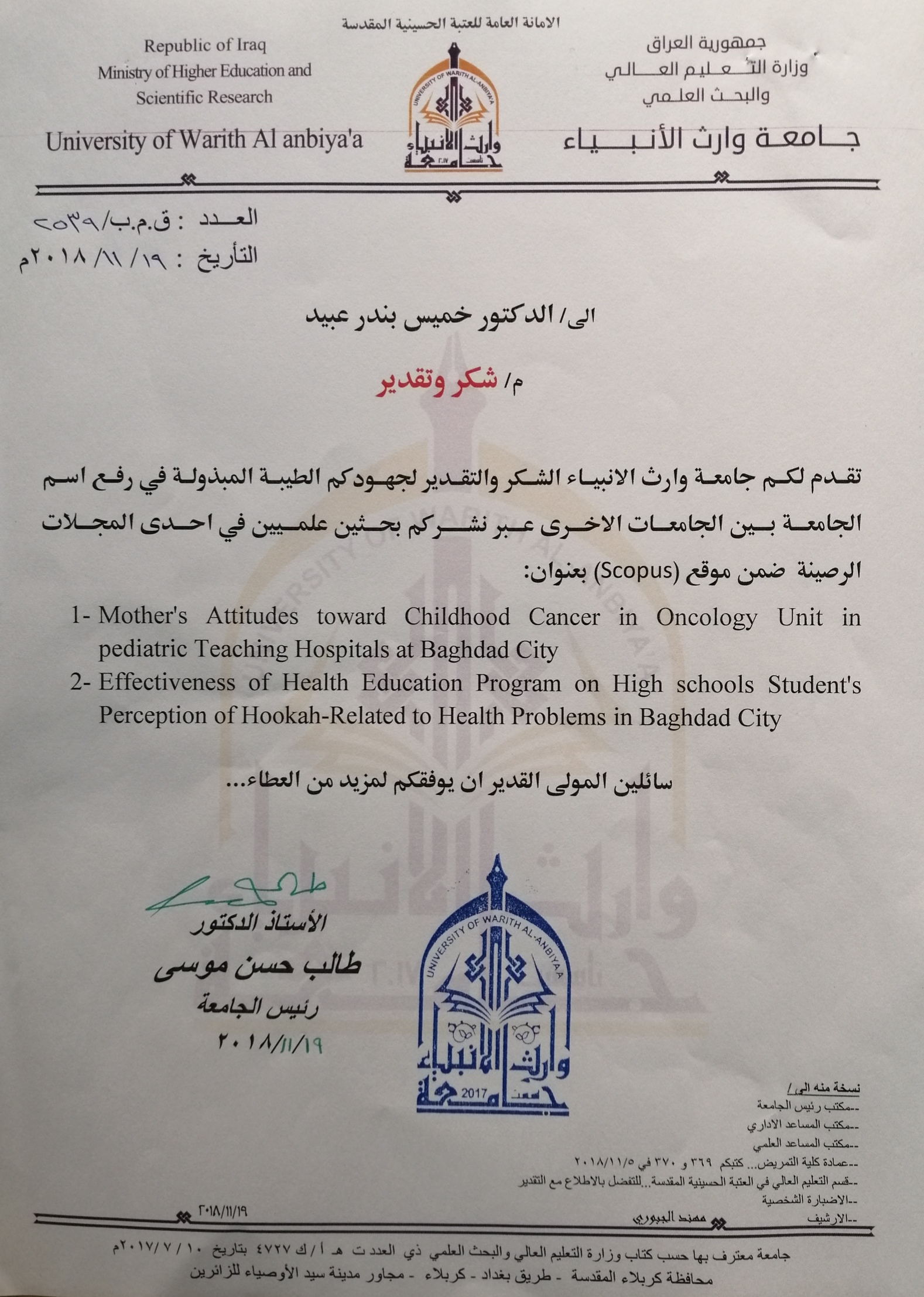 وجه الاستاذ الدكتور طالب حسن موسى  /رئيس جامعة وارث الانبياء كتاب شكر وتقدير الى الأستاذ المساعد الدكتور خميس بندر عبيد السعيدي /عميد كلية التمريض/جامعة وارث الانبياء  وذلك لنشرة بحثين علميين في مجلة عالمية ويعد هذا العمل حلقة انجاز تضاف الى انجازات الكلية والجامعة على الصعيد العالمي في نشر البحوث.