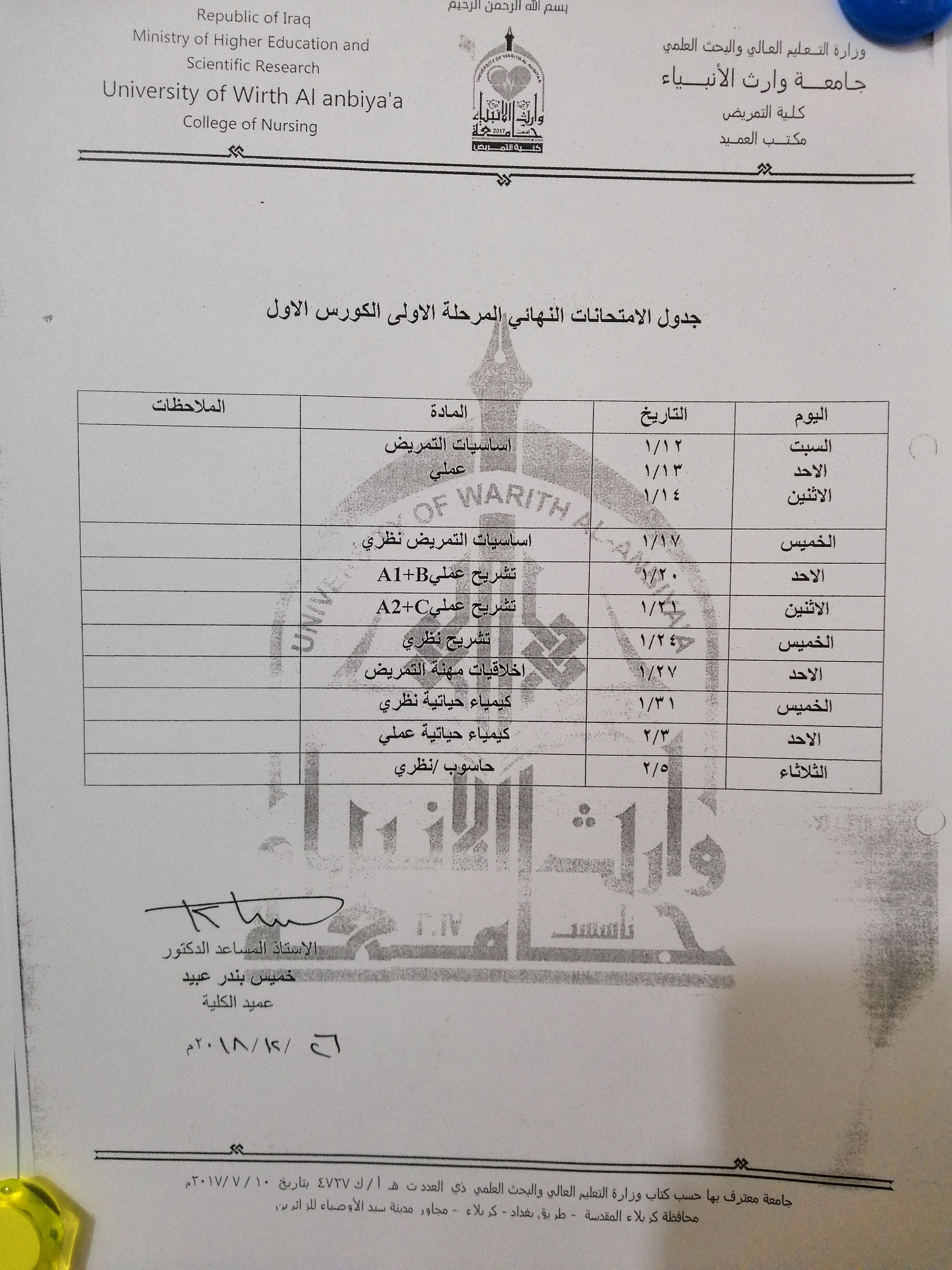 جداول توزيع طلبة كلية التمريض وكلية العلوم الاسلامية على القاعات الامتحانية لامتحانات نهاية الكورس الاول للعام الدراسي 2018/2019.