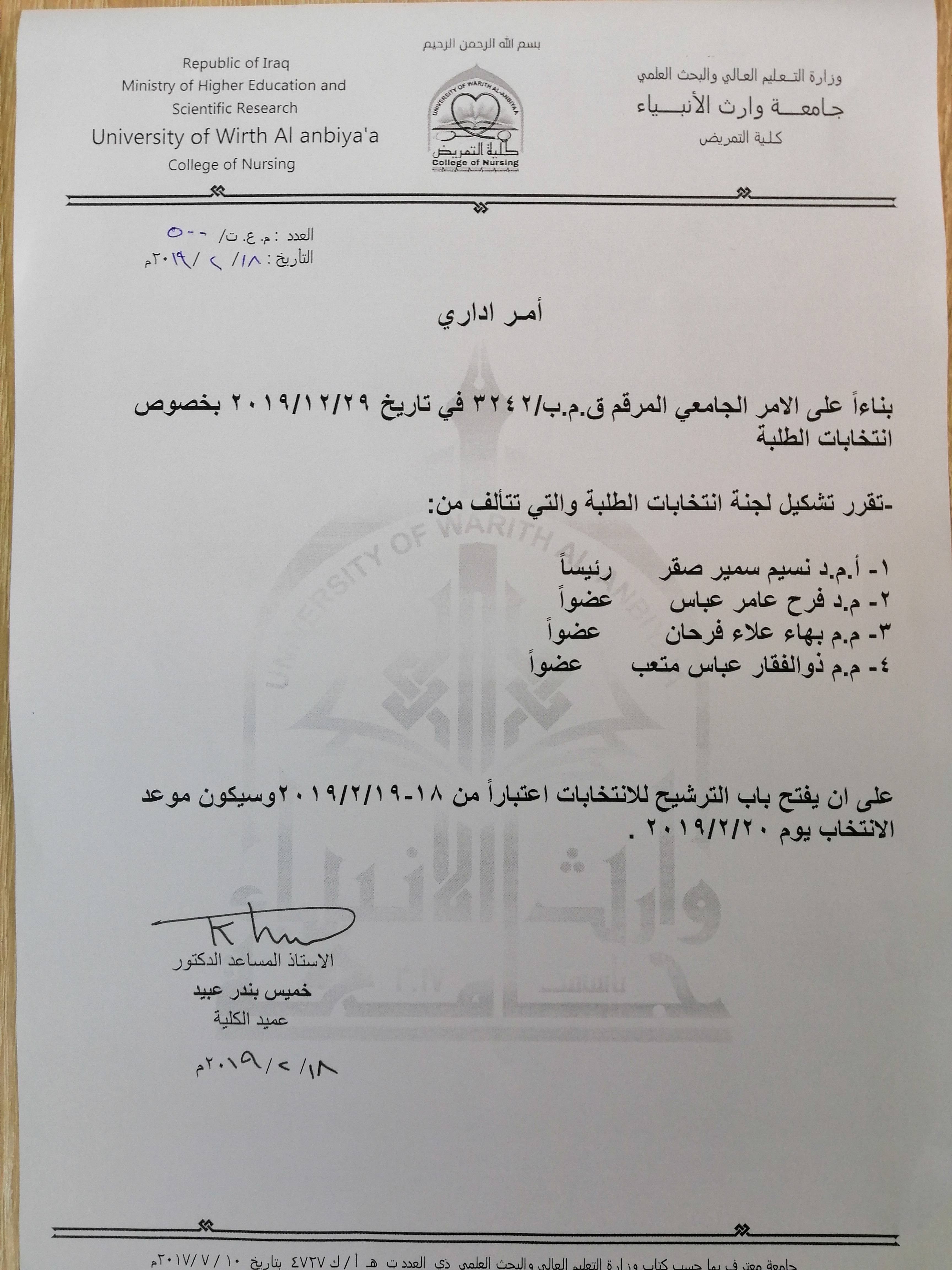كلية التمريض تعلن عن تشكيل لجنة انتخابات الطلبة.فعلى الطلبه الراغبين بالمشاركه ترشيح اسمائهم  الى عمادة الكلية.وحسب ما مبين في الكتاب اعلاه.
