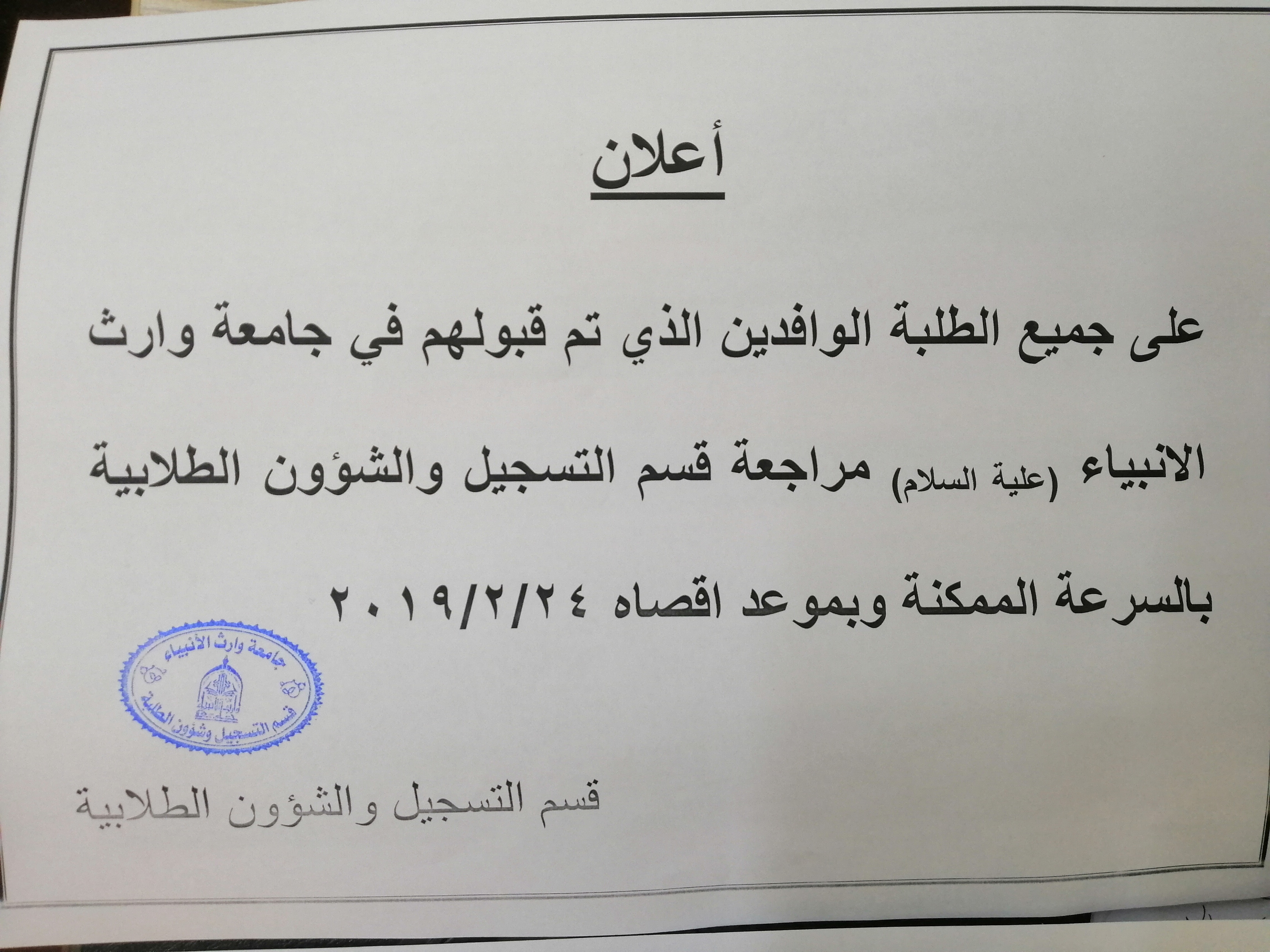 على الطلبة الوافدين الى جامعة وارث الانبياء للعام الدراسي ٢٠١٩/٢٠١٨ مراجعة قسم التسجيل بالسرعه الممكنه بموعد اقصاه ٢٠١٩/٢/٢٤  وحسب الكتاب المبين اعلاه.