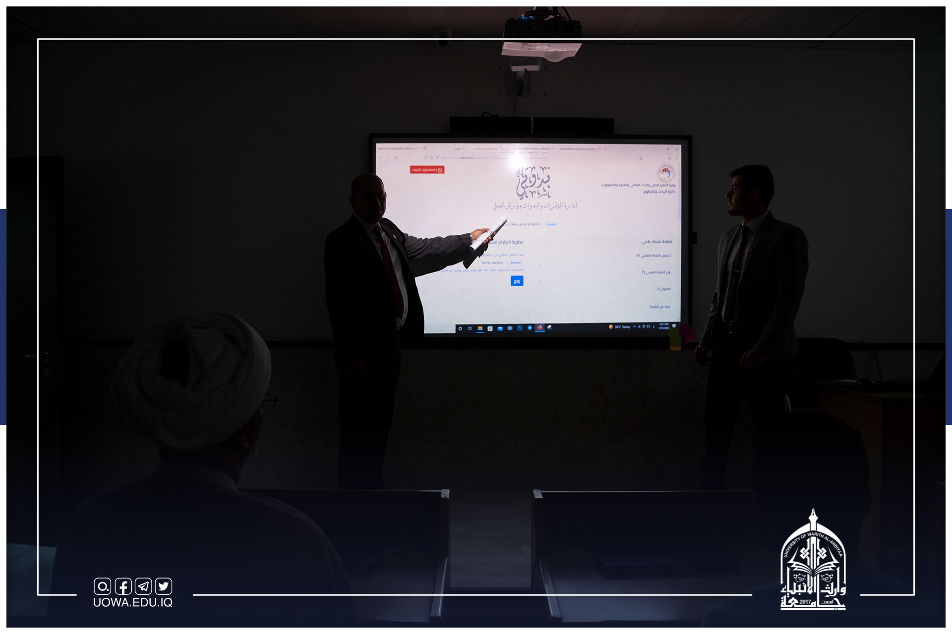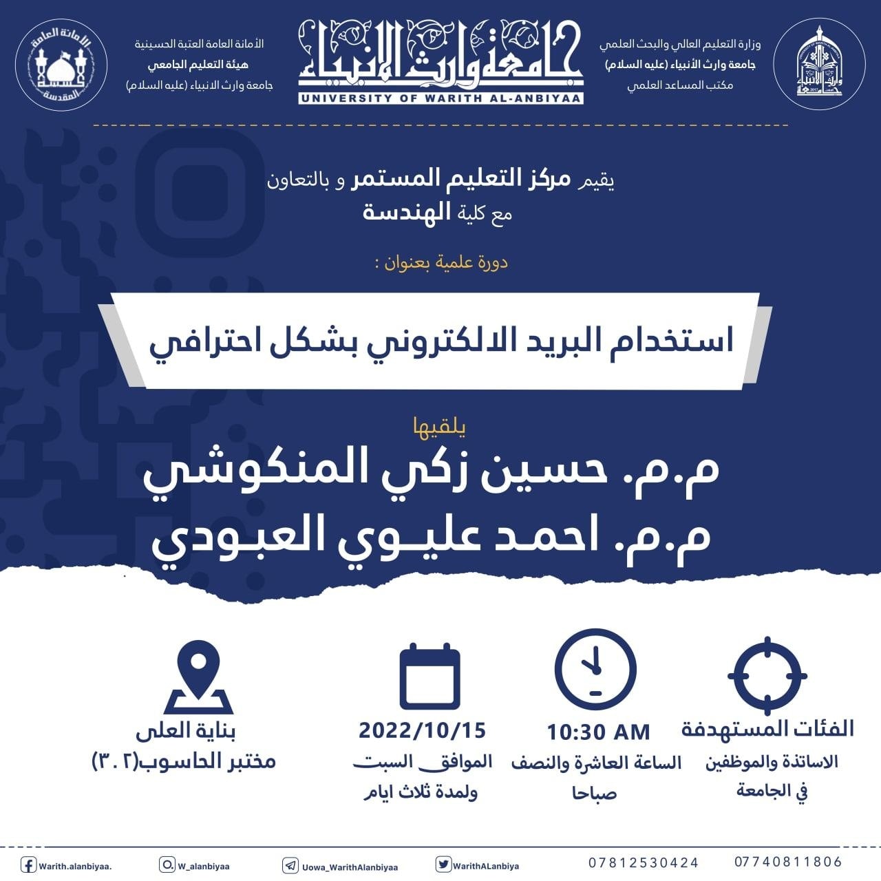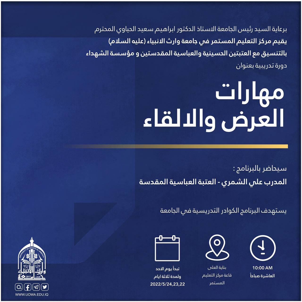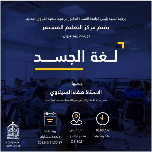 برعاية رئيس جامعة وارث الأنبياء (عليه السلام) الأستاذ الدكتور إبراهيم الحياوي يقيم مركز التعليم المستمر وبالتعاون مع العتبتين المقدستين ومؤسسة الشهداء/ كربلاء دورة تدريبية بعنوان "مهارات العرض والالقاء"