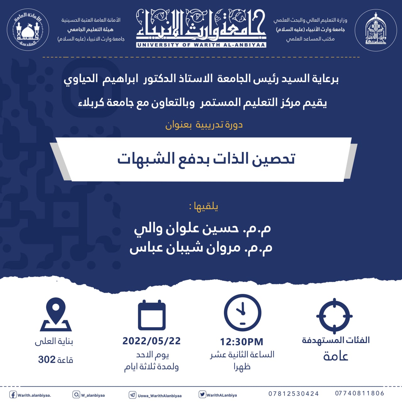 برعاية رئيس جامعة وارث الأنبياء (عليه السلام) الأستاذ الدكتور إبراهيم الحياوي نظم مركز التعليم المستمر وبالتعاون مع جامعة كربلاء دورة تدريبية بعنوان "تحصين الذات بدفع الشبهات"