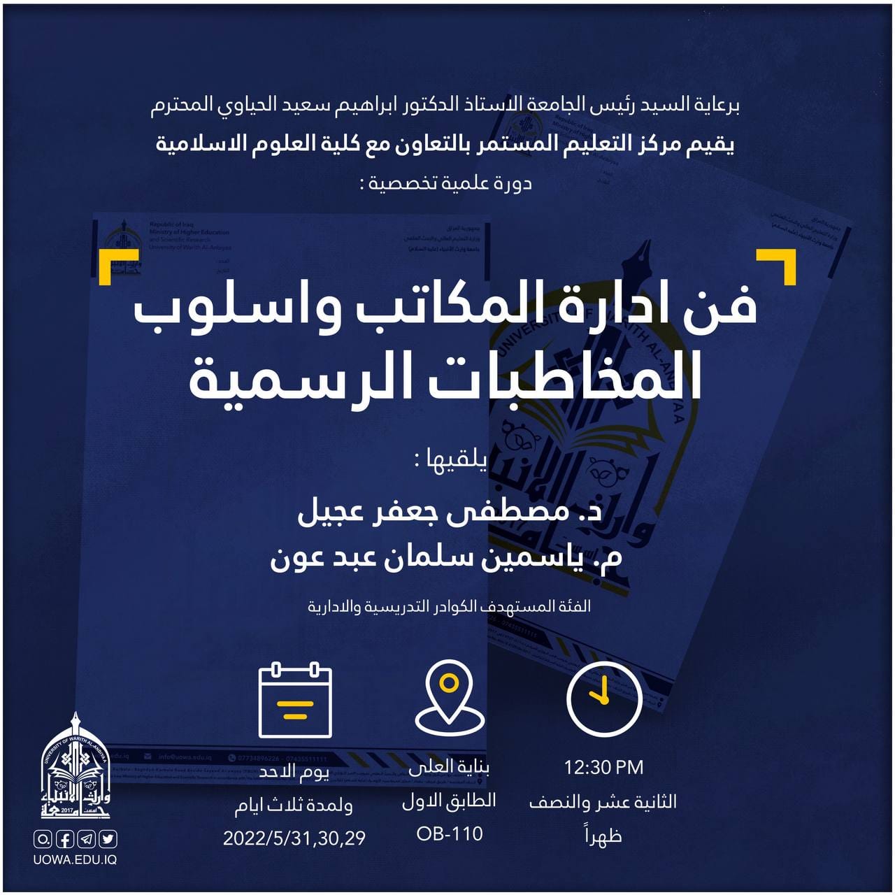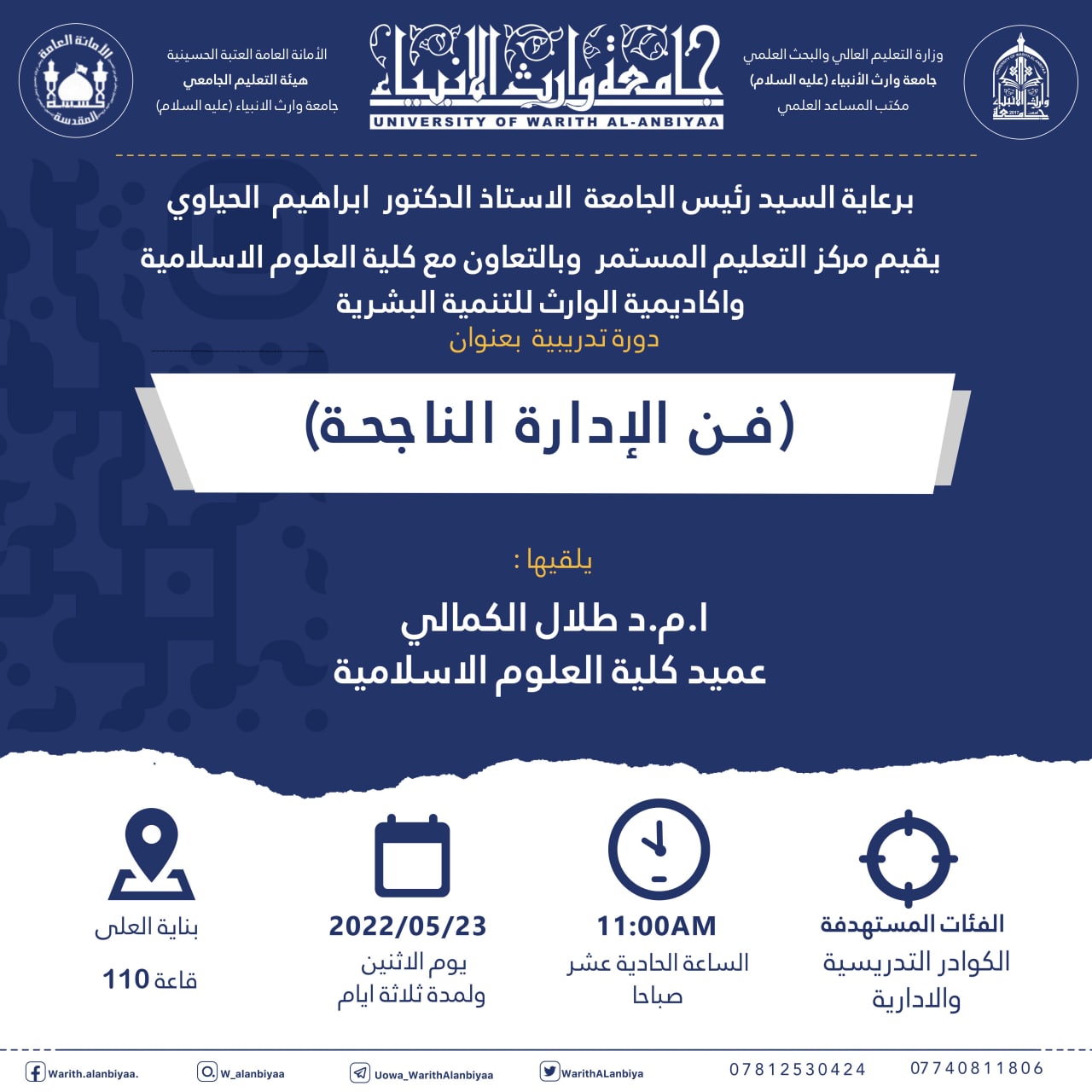 برعاية رئيس جامعة وارث الأنبياء (عليه السلام) الأستاذ الدكتور إبراهيم الحياوي يقيم مركز التعليم المستمر وبالتعاون مع كلية العلوم الإسلامية دورة تدريبية بعنوان "فن الإدارة الناجحة"