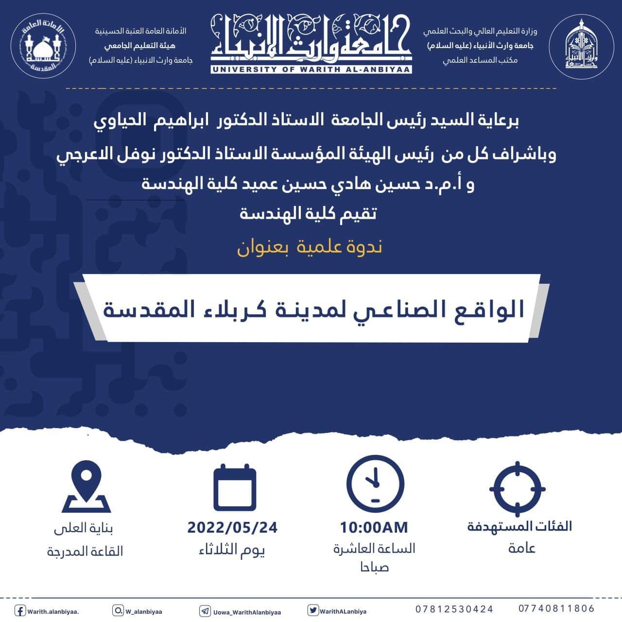 تقيم نقابة الاكاديميين العراقيين فرع كربلاء بالتعاون مع جامعة وارث الأنبياء (عليه السلام)