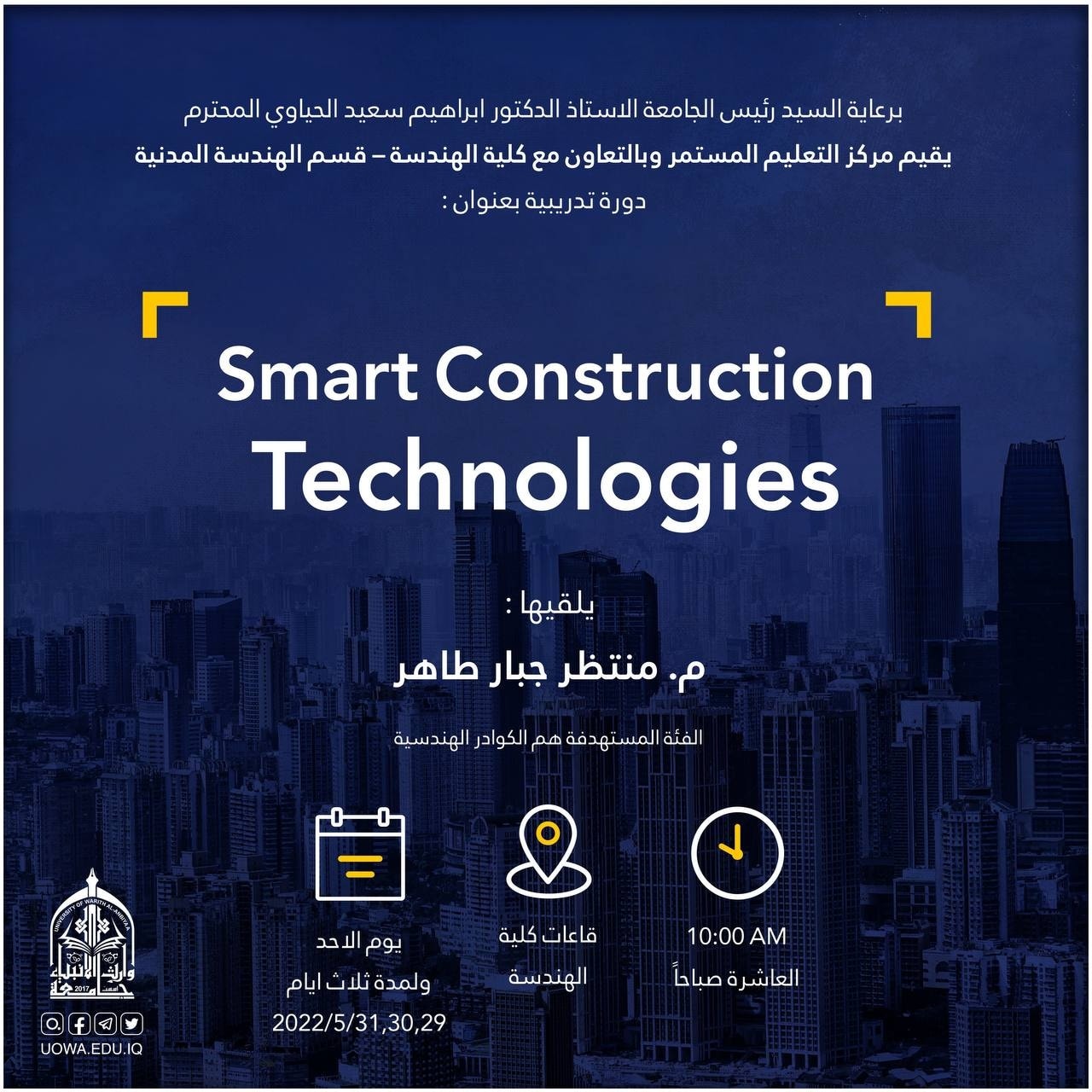 برعاية رئيس الجامعة الأستاذ الدكتور إبراهيم الحياوي، يقيم مركز التعليم المستمر وبالتعاون مع كلية الهندسة- قسم الهندسة المدنية
