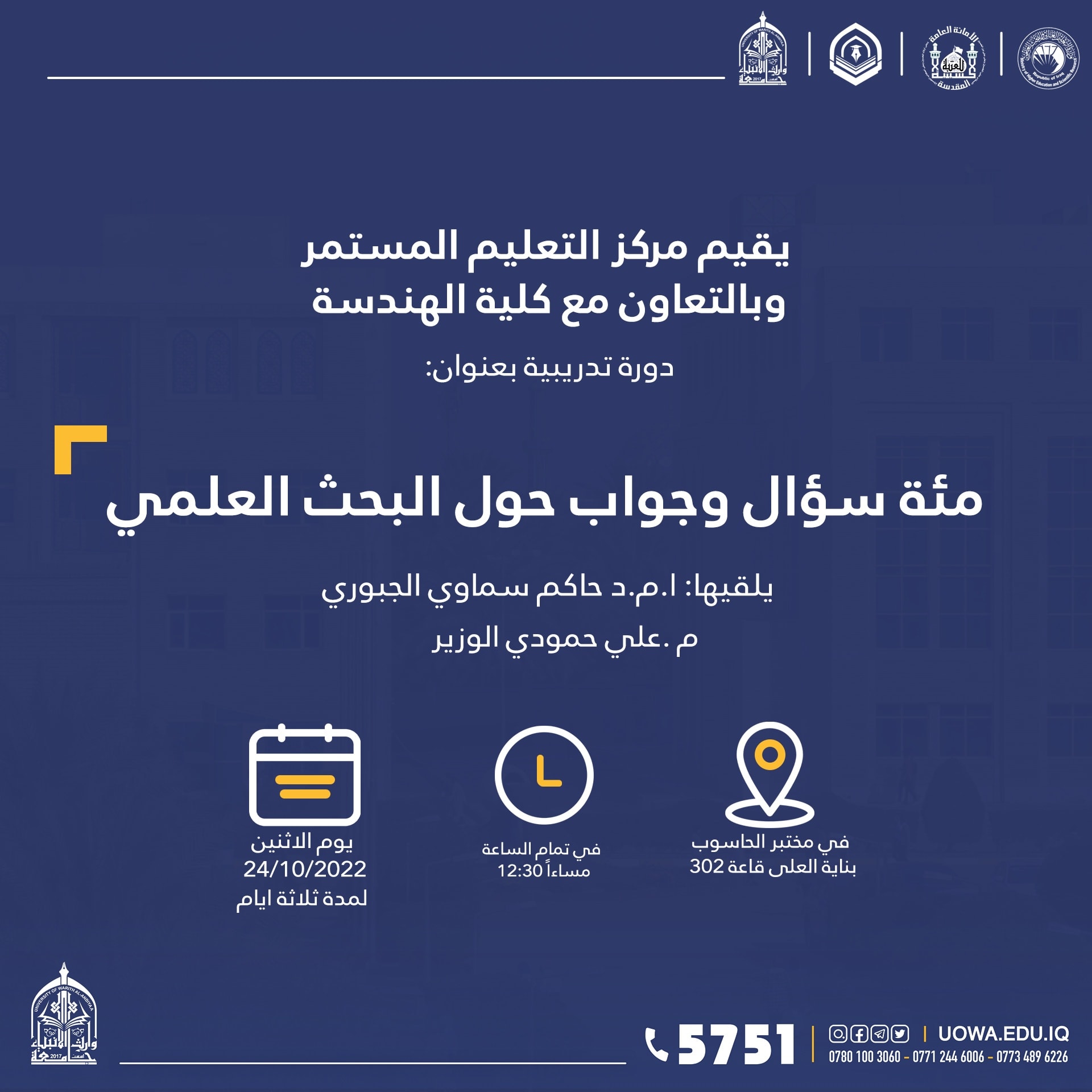 "مئة سؤال وجواب حول البحث العلمي" دورة تدريبية أقامها مركز التعليم المستمروبالتعاون مع كلية الهندسة