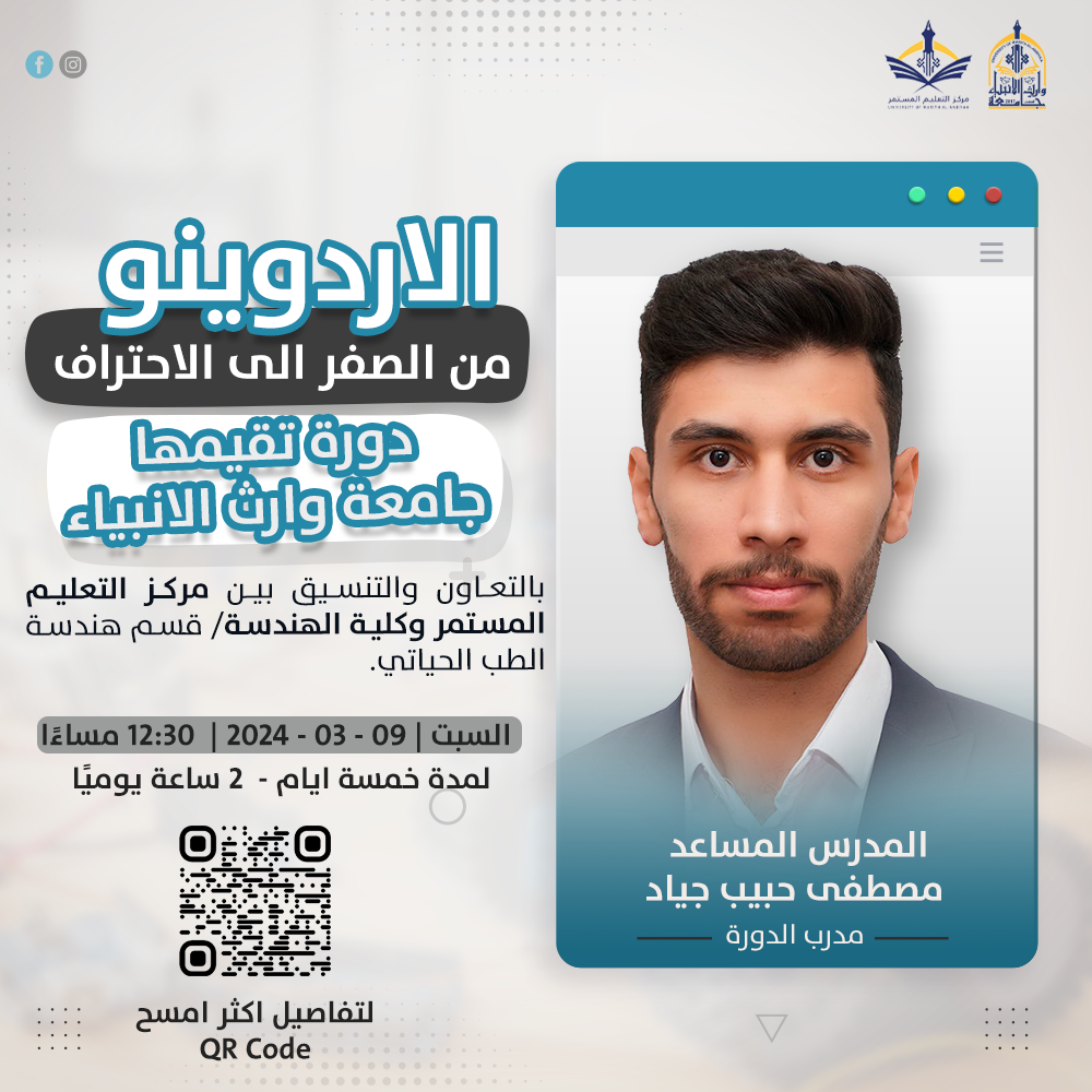تنظم كلية الهندسة، قسم هندسة الطب الحياتي، بالتعاون مع مركز التعليم المستمر، دورة تدريبية مكثفة تحت عنوان (الاردينو من الصفر إلى الاحتراف). تم تقديمها بشكل ممتاز من قبل المدرس المساعد مصطفى حبيب جياد.