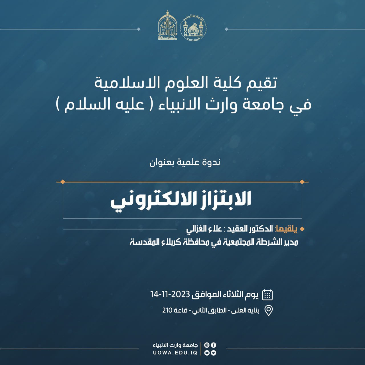 تقيم كليه العلوم الاسلاميه في جامعه وارث الانبياء )عليه السلام( ندوه علميه بعنوان )الابتزاز الالكتروني(.