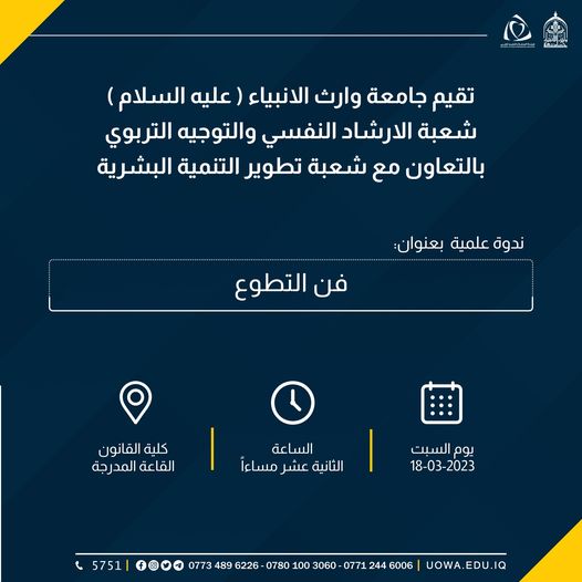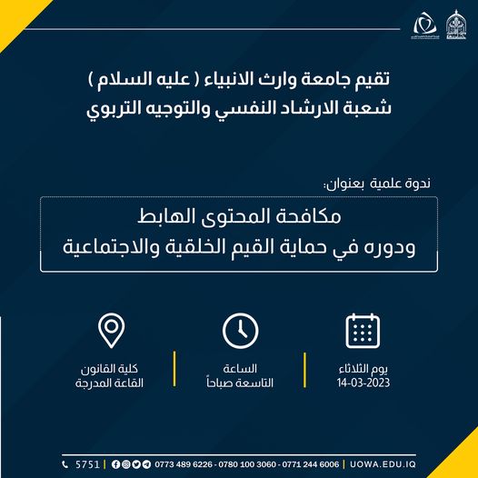 ندوة علمية توعوية بعنوان(تصويب الاخطاء اللغوية الشائعة على مواقع التواصل الاجتماعي)، أقامتها شعبة الارشاد النفسي والتوجيه التربوي في جامعة وارث الانبياء(عليه السلام) وبالتعاون مع قسم الشؤون العلمية