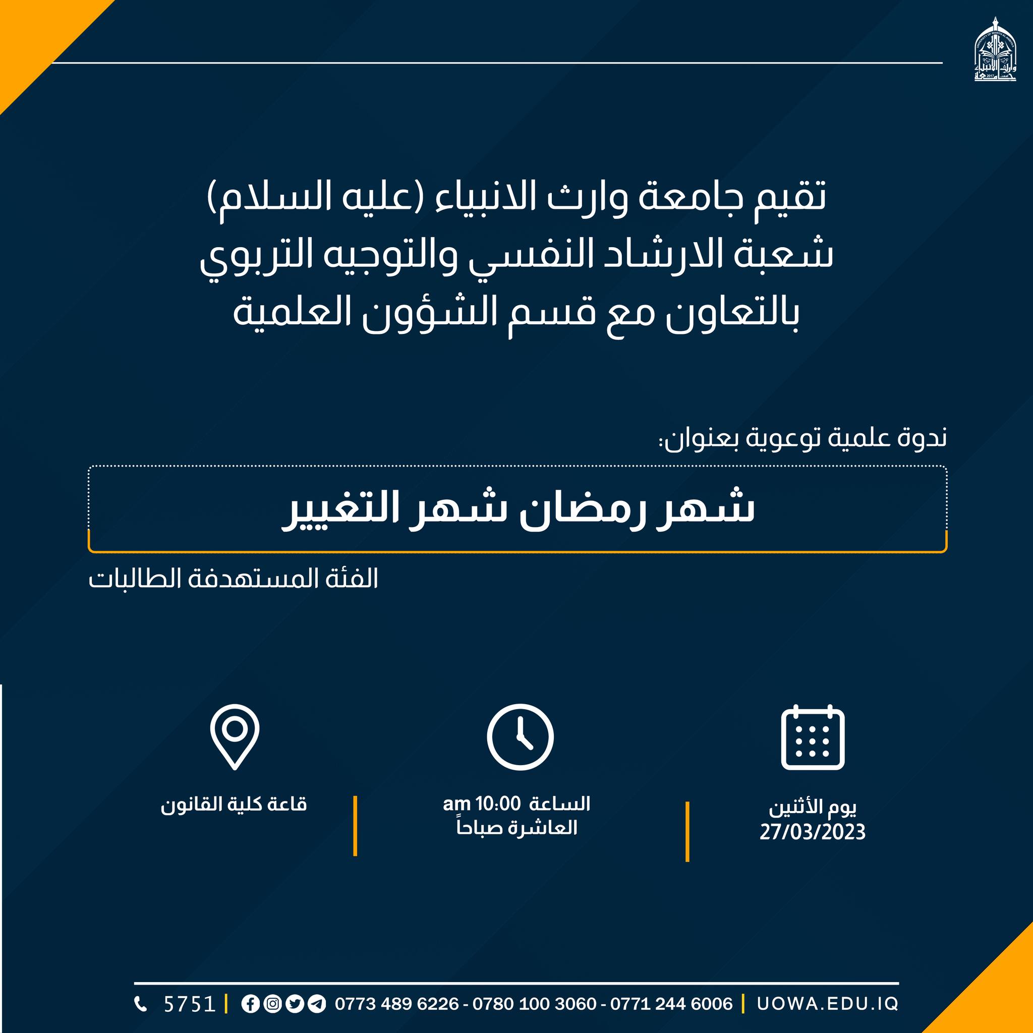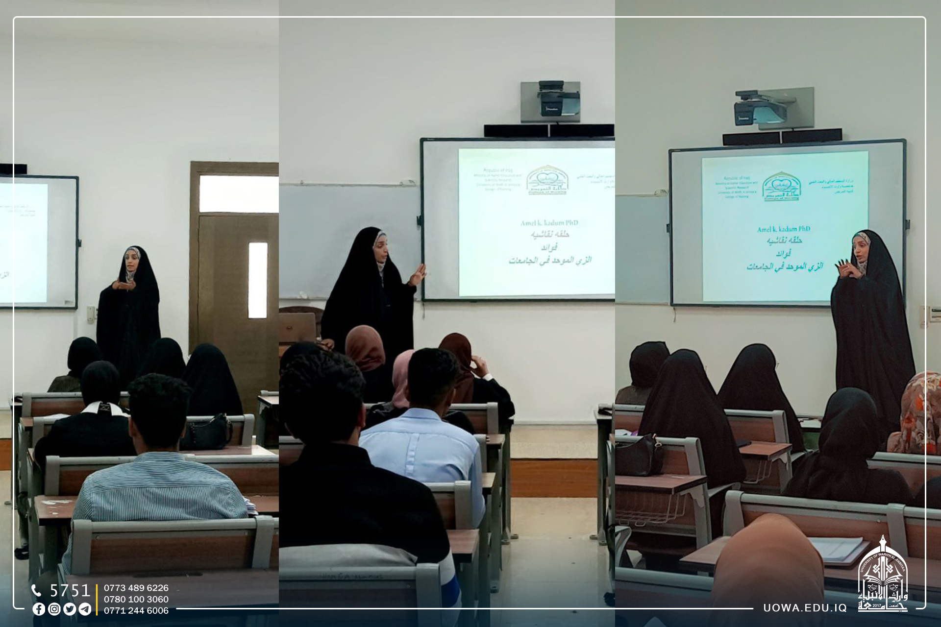 أقامت جامعة وارث (عليه السلام) / شعبة الارشاد النفسي والتوجيه التربوي مع قسم الشؤون العلمية، ندوة علمية توعوية بعنوان "المعلم الالكتروني في المستقبل"