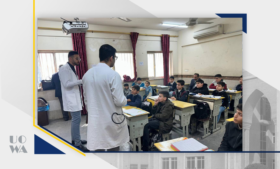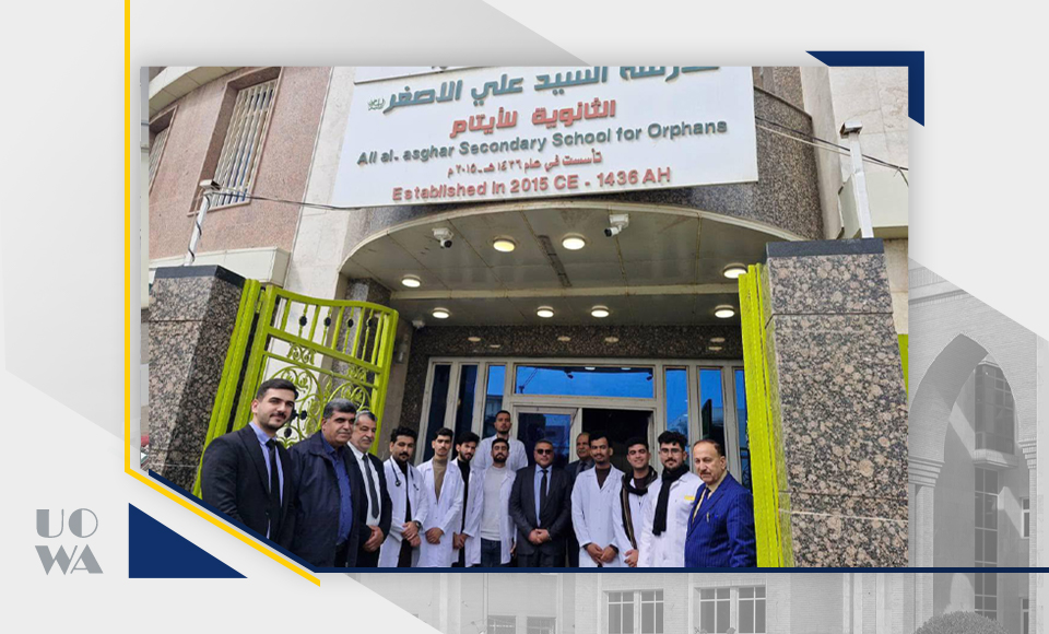 Under the slogan (A Message of Hope and Knowledge) and within the framework of social responsibility, the College of Medicine, under the direction of the respected Dean of the College, Professor Dr. Ali Abdul Saadoun, organized a team of students on an awareness visit to orphan schools (Sayyida Ruqayya Elementary and Secondary School for Girls and Ali Al-Asghar Elementary and Secondary School), with the aim of providing psychological and cognitive support to students, and enhancing their awareness in various life, educational and health fields. The visit was a wonderful opportunity to spread hope and positivity among primary and secondary school students, through educational lectures and interactive workshops, aimed at developing their skills, enhancing their self-confidence, increasing their health awareness and encouraging them to be up to their future responsibilities. The student team was accompanied by the respected assistant, Professor Dr. Laith Abbas, Professor Dr. Taleb Jawad, Lecturer Dr. Maher Abboud and Engineer Mr. Muhammad Baqer. The team was keen to provide sessions on the importance of education, caring for mental and physical health, developing personal skills, and supporting their academic career. During the visit, we saw the spirit of challenge and determination in the eyes of the students, which confirmed the importance of such initiatives in enhancing their self-confidence and making them feel that society cares about them.