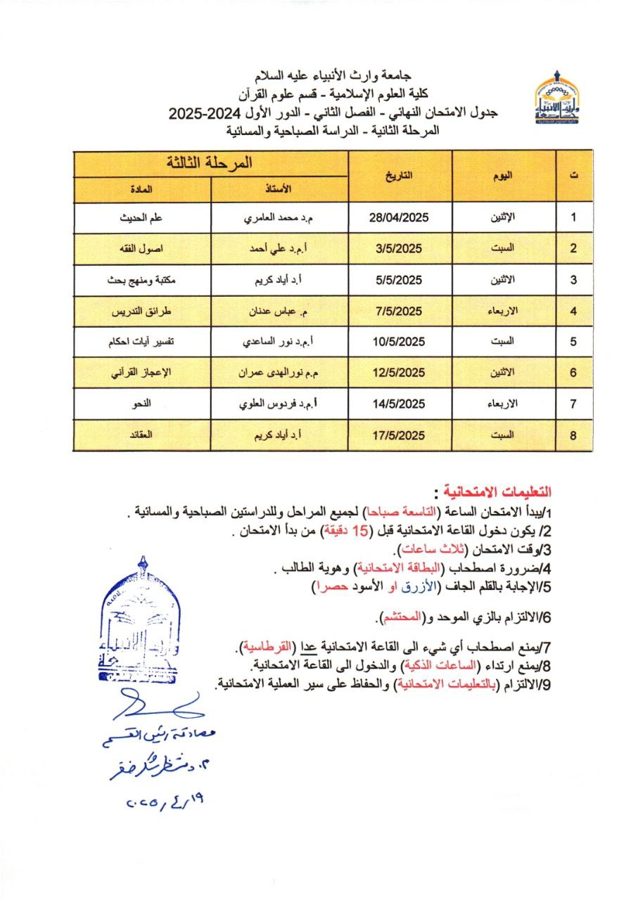 The College of Islamic Sciences at the University of Warith Al-Anbiyaa (peace be upon him) announces the commencement of the second semester exams for the academic year 2024–2025, starting on Monday, April 28, 2024.