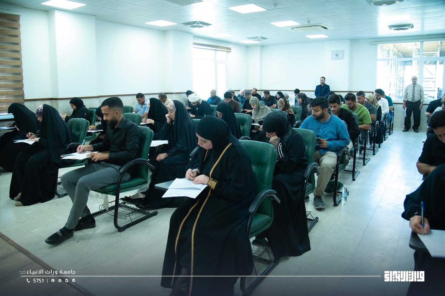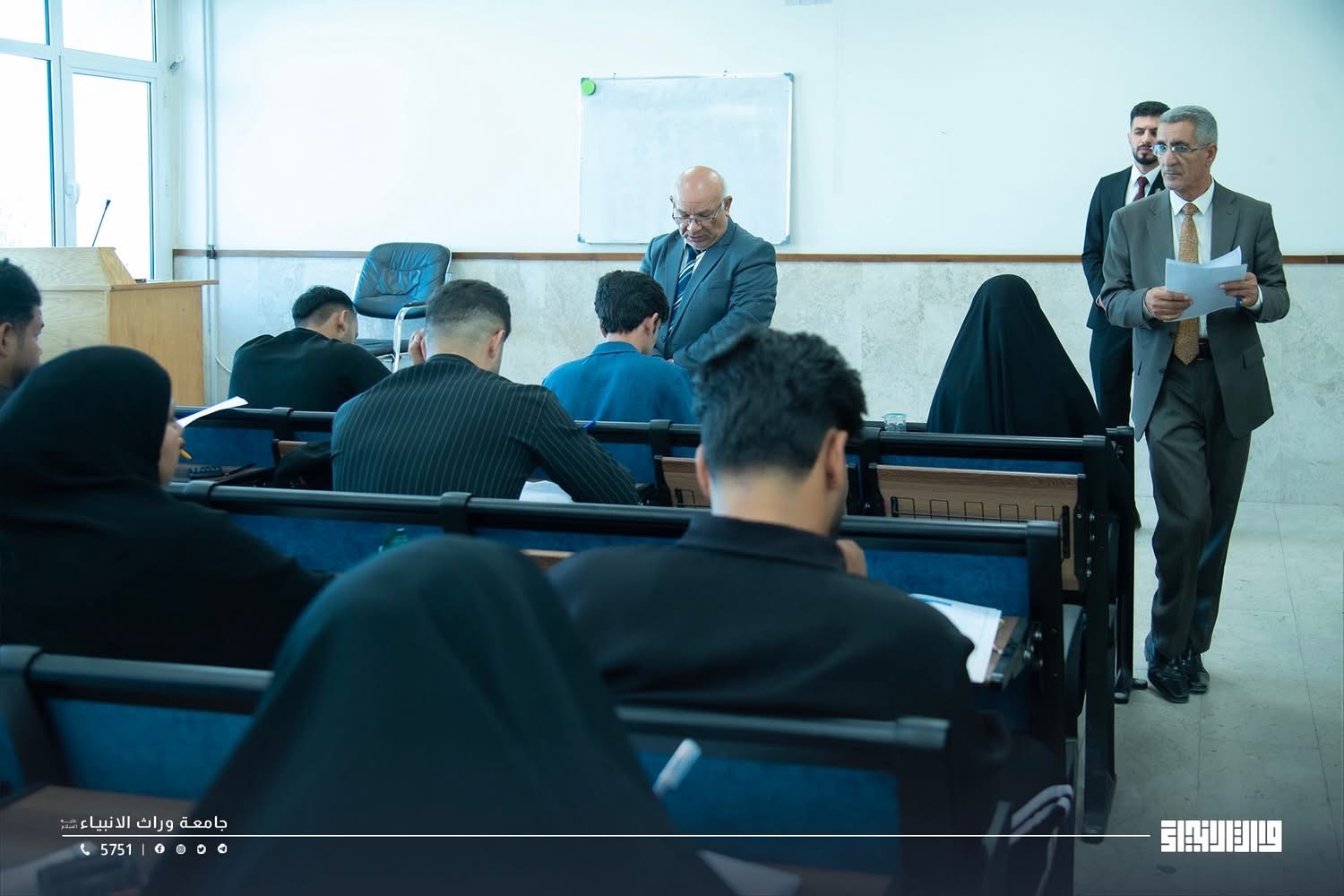 Students of the College of Administration and Economics at the University of Warith Al-Anbiyaa are taking the second-round examinations in a highly organized atmosphere, under the direct supervision of the esteemed Dean.