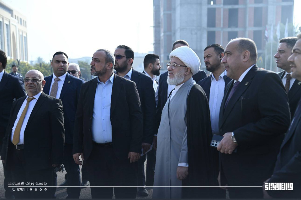 Today, Sheikh Abdul-Mahdi Al-Karbalaei, the representative of the Supreme Religious Authority, visited the University of Warith Al-Anbiyaa, where he was welcomed by the University President, Professor Dr Ibrahim Saeed Al-Hayyawi. The visit formed part of an inspection tour to review ongoing expansion and development projects within the university, undertaken as part of its strategic plans to enhance the quality of education and develop the campus environment.