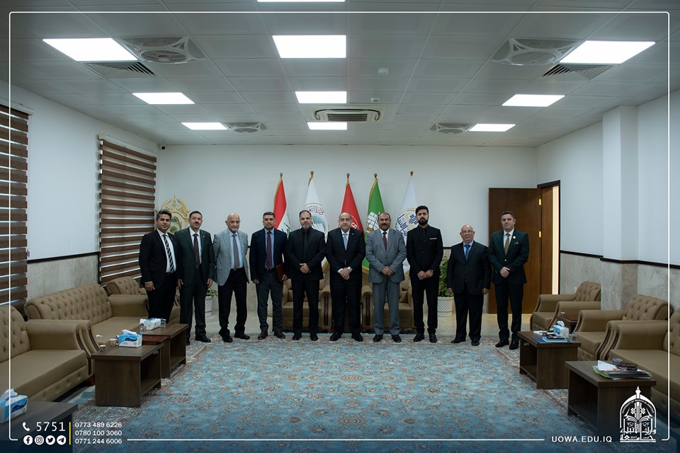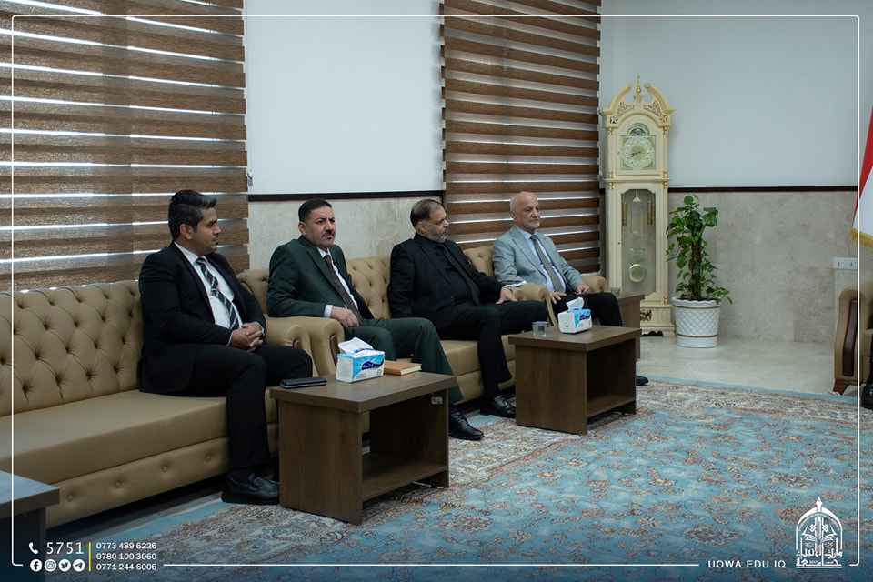 The delegation was received by Mr. Ibrahim Al-Hayawi, the President of the University, along with Dr. Munir Al-Daami, the head of the Academic Union Branch in Karbala, and Sheikh Rabaah Hussein Al-Rabaah, a legal expert.