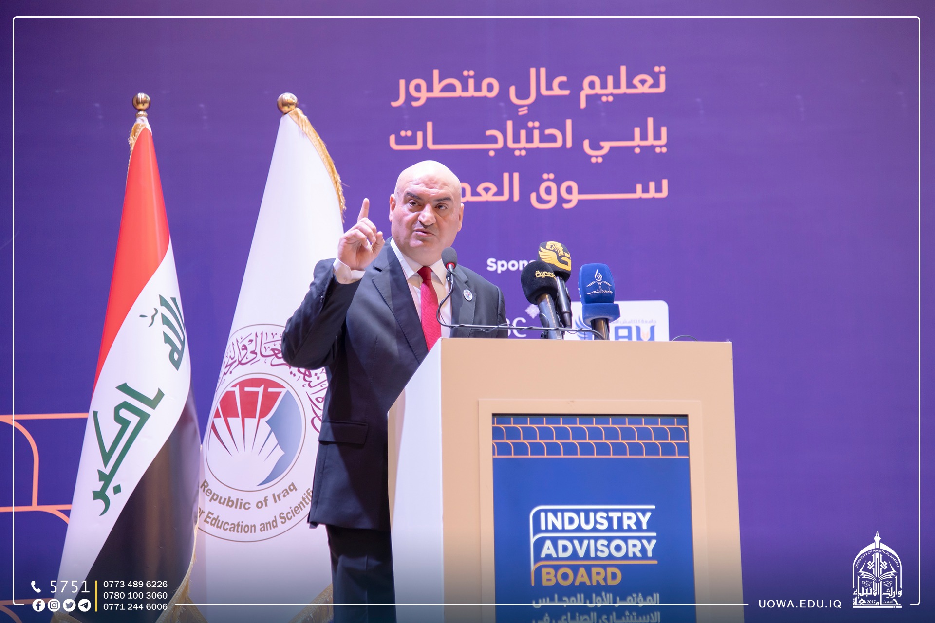 Under the patronage of the Minister of Higher Education and Scientific Research, Dr. Naeem Al-Aboudi, a delegation from the University of Warith Al-Anbiyaa (Peace Be Upon Him), led by Professor Dr. Ibrahim Al-Hayawi, participated in the launch of the "First Conference of the Industrial Advisory Council in Iraqi Universities." The conference is organized by the Ministry of Higher Education and Scientific Research.
