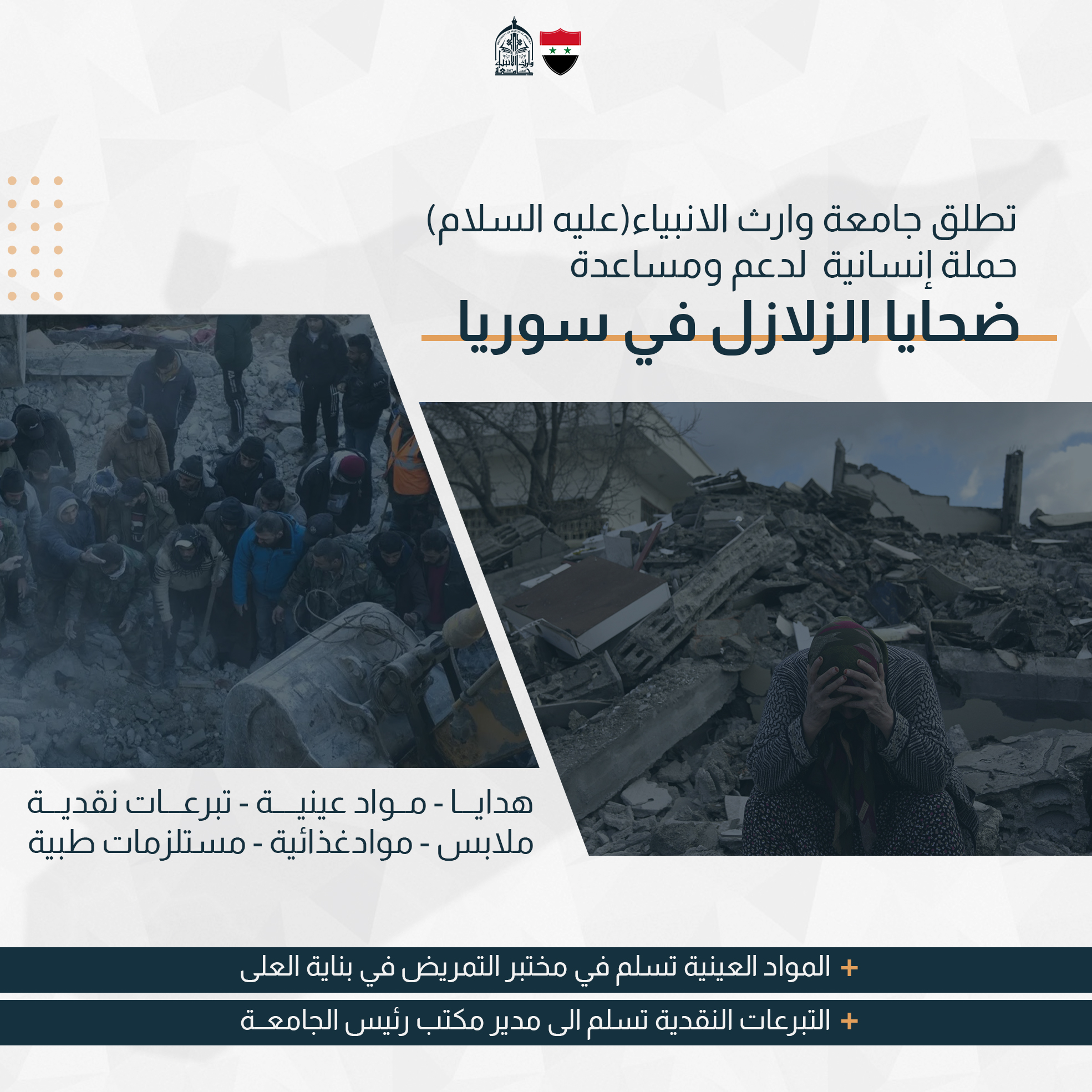 "The University of Warith Al-Anbiyaa launches a humanitarian campaign to support and assist the victims of the earthquake in Syria."