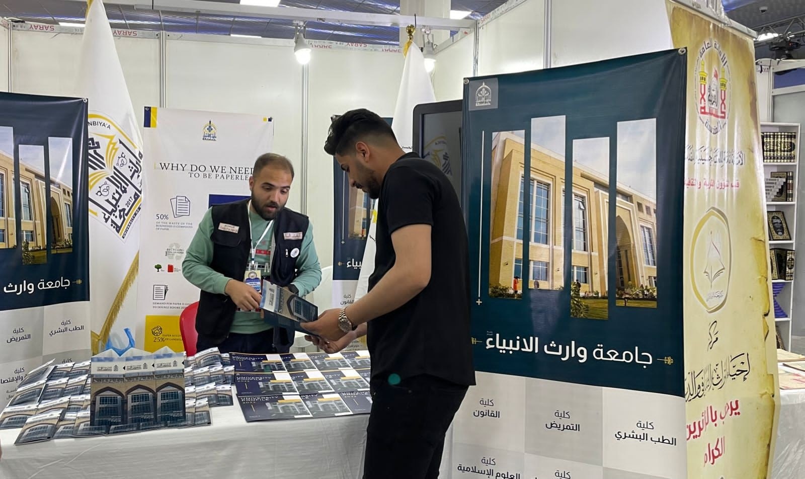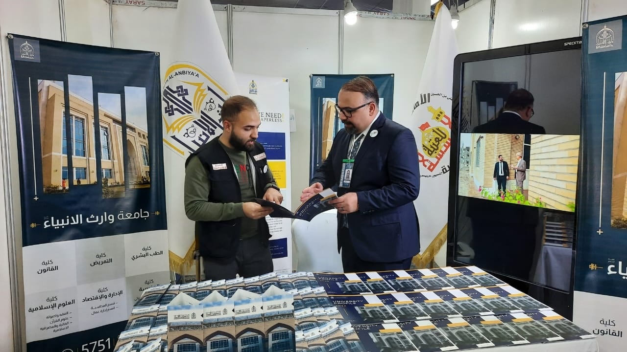 In the presence of the religious custodian of the Abbasid Holy Shrine, His Eminence Sayed Ahmed Al-Safi, and the Deputy Secretary-General of the Holy Hussein Shrine, Dr. Alaa Diaa Al-Din, the University of Warith Al-Anbiyaa participated, represented by the Media and Public Relations Department, in the (Ain Al-Hayat) festival organized by the "Al-Qabas Foundation for Culture and Development." The festival included the participation of the holy shrines in Iraq and various religious institutions, aiming to clarify the correct ideology and upright behavior to confront intellectual deviations and attacks faced by society, especially in religious aspects, including Mahdavi thought issues.