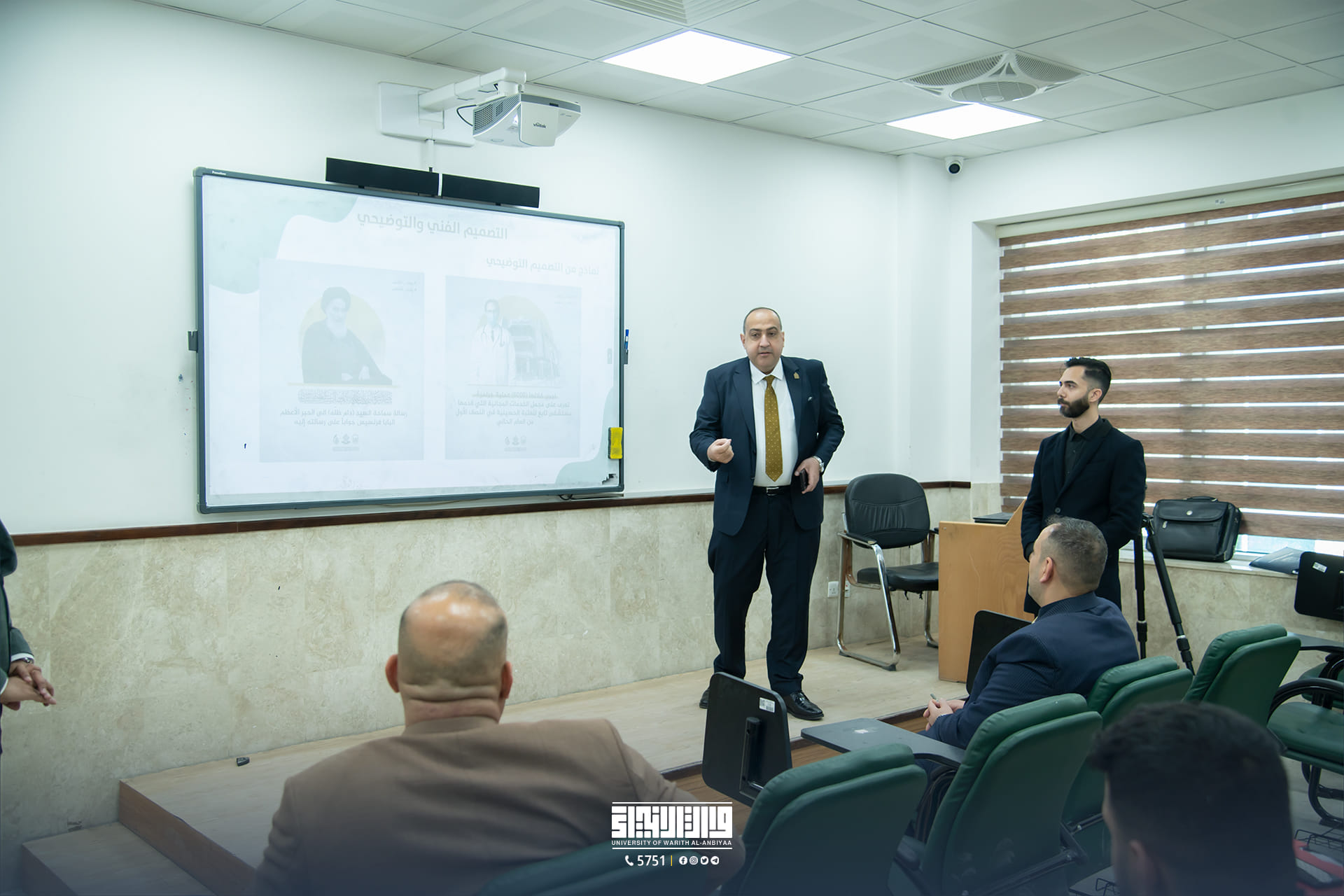 In the presence of Mr. Ibrahim Al-Hayawi, the University President, and Dr. Mohamed Jamal Al-Taif, the Dean of the College of Media, the Department of Digital Media at the College of Media, in collaboration with the Media Department at the Holy Hussainiya Shrine, organized a scientific workshop titled "Digital Design Using Artificial Intelligence Techniques" presented by designer Osama Adnan Al-Khayyat from the Media Office of the Holy Hussainiya Shrine.