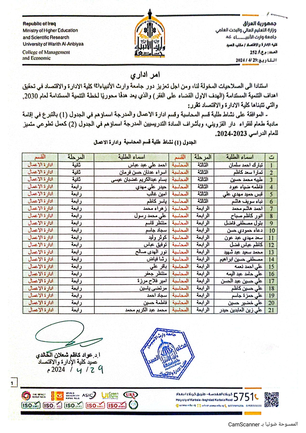 The College of Administration and Economics, along with its students, organized a food banquet for the poor at Al-Qazwini House as part of their voluntary work and humanitarian efforts to support the community.