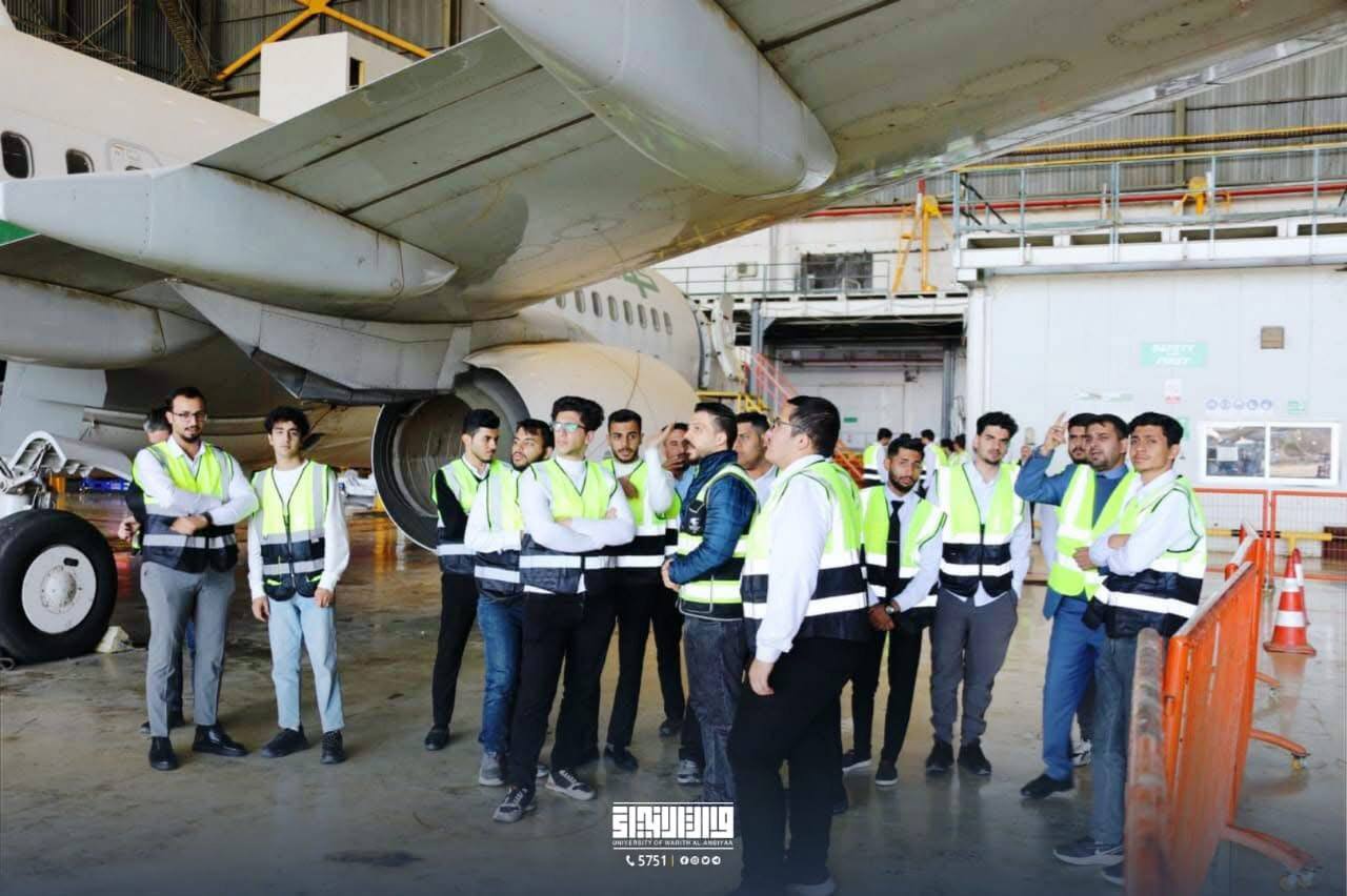 The visit included a comprehensive tour of the various sections of the airport, with a focus on the Iraqi Airways website. The students learned about non-destructive maintenance (NDT) lines for aircraft parts, engine and wheel system maintenance lines, in addition to other details related to aircraft maintenance.
